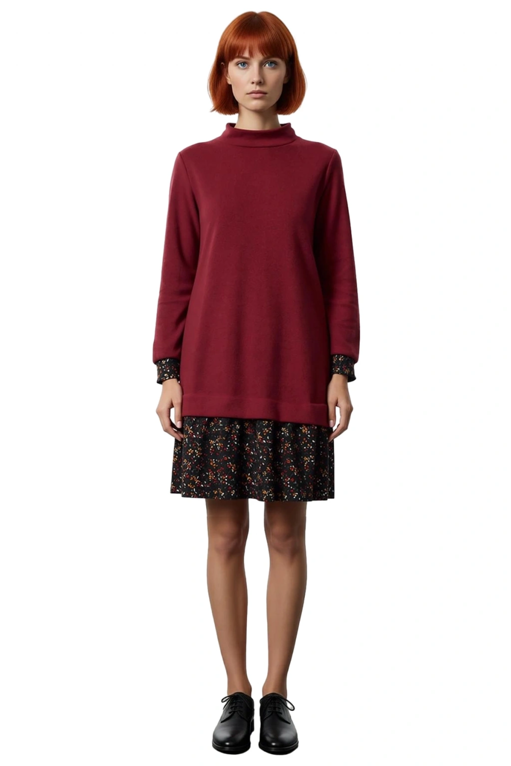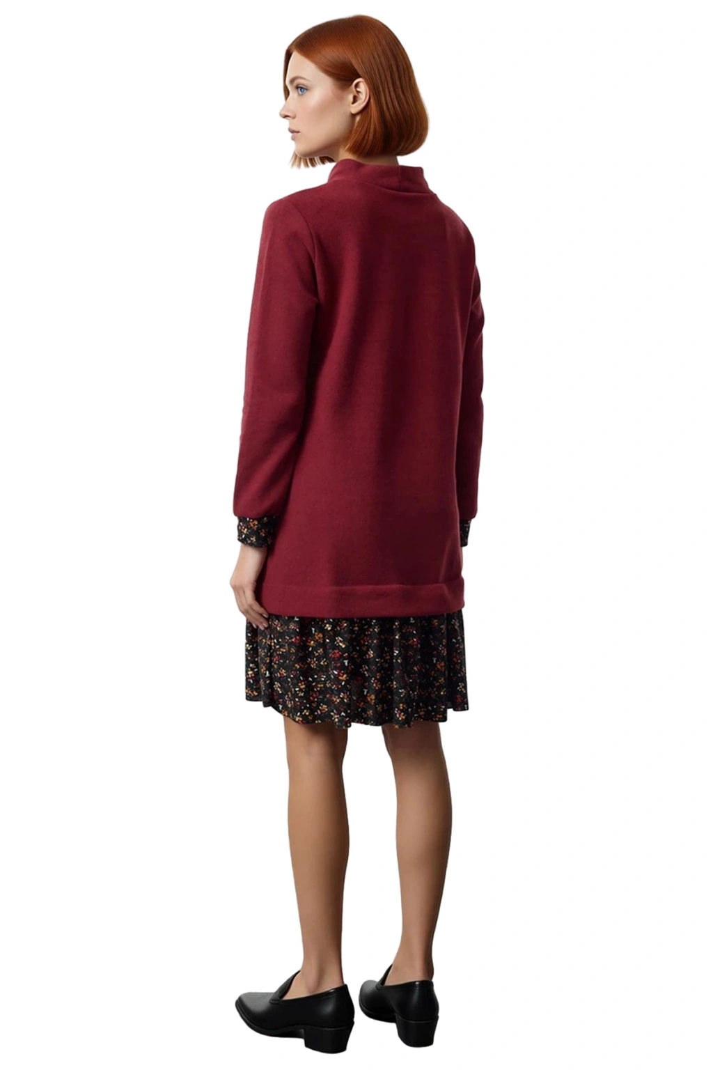Ürün Özellikleri: Shift kalıp, pamuk polyester materyal, çiçek desenli, dik yaka, standart kol, örme kumaş, bordo renk.