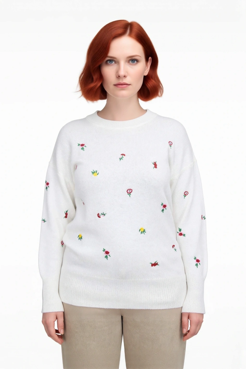 Ürün Özellikleri: Regular kalıp, akrilik polyester materyal, çiçekli desen, bisiklet yaka, standart uzun kol, triko kumaş, ekru renk, orta kalınlık.