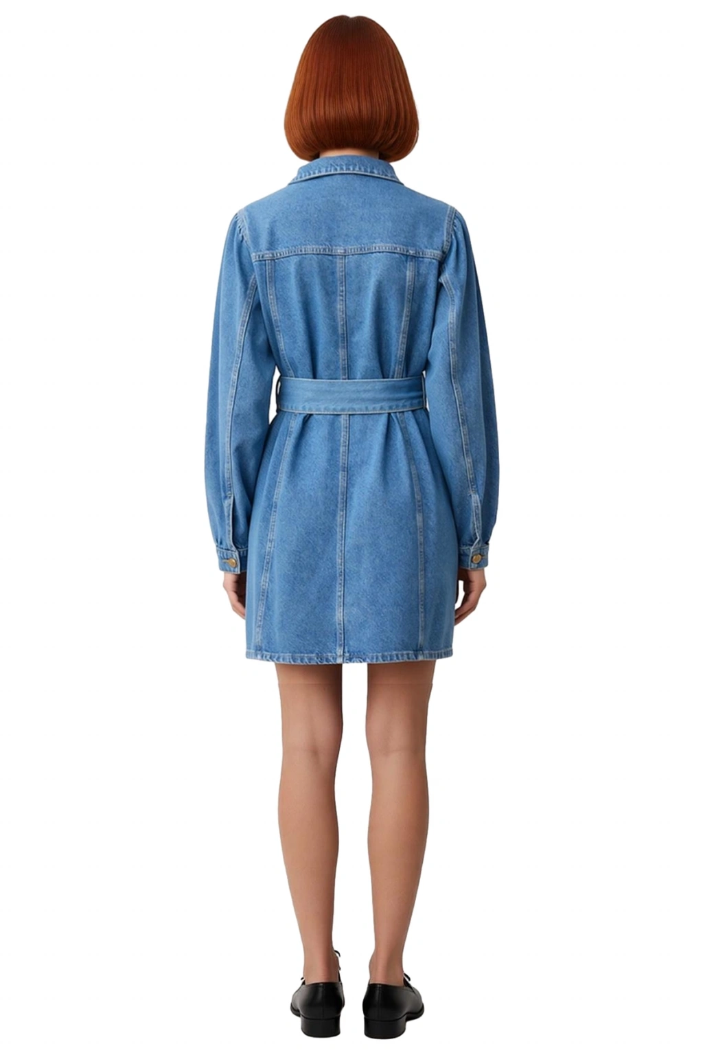 Ürün Özellikleri: Ceket Elbise kalıp, %100 Pamuk materyal, düz desen, gömlek yaka, balon kol, denim kumaş, mavi renk.