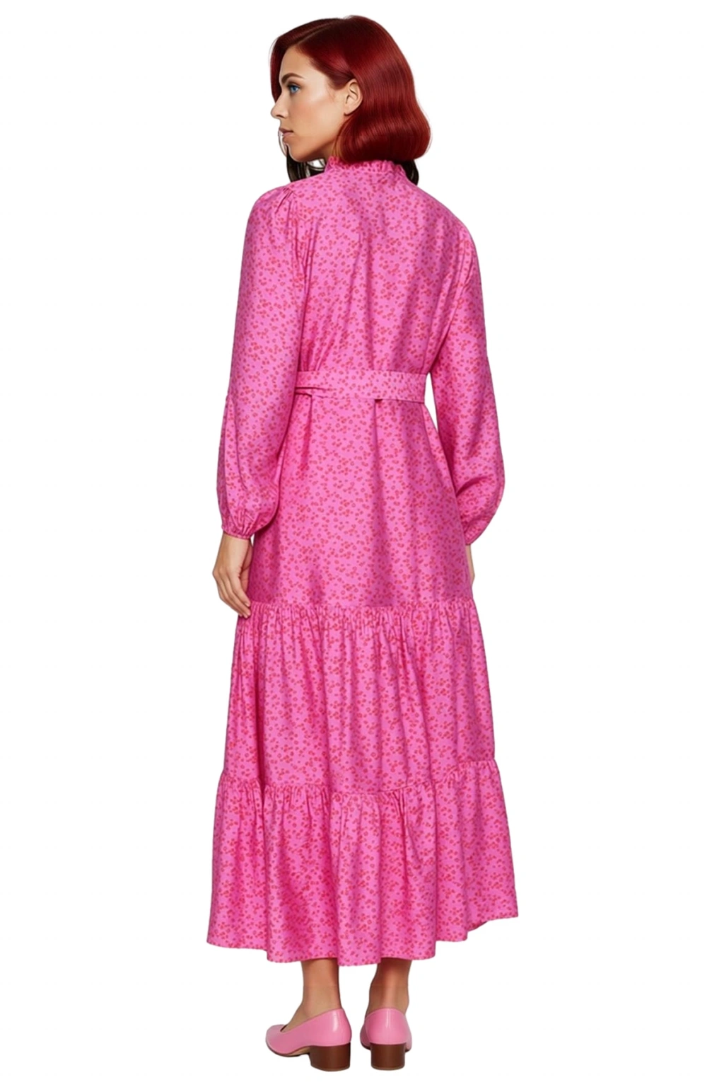 Ürün Özellikleri: Shift kalıp, 85% viskoz 15% poliamid materyal, çiçekli desen, gömlek yaka, standart kol, dokuma kumaş, pembe renk, kuşaklı tasarım, maxi boy, astarlı.