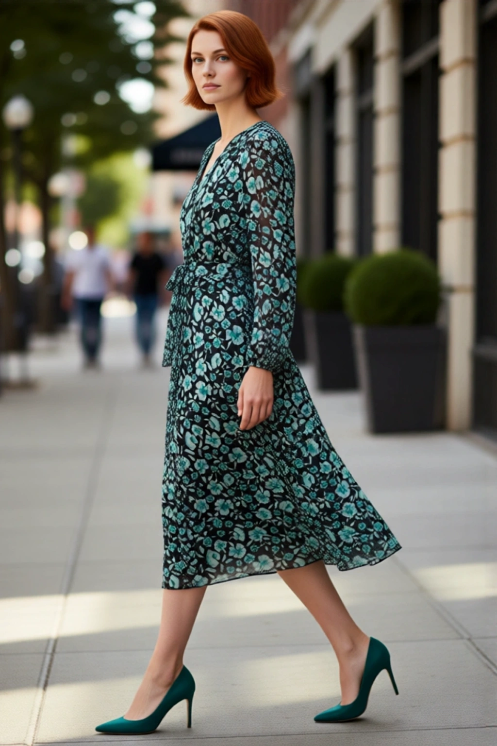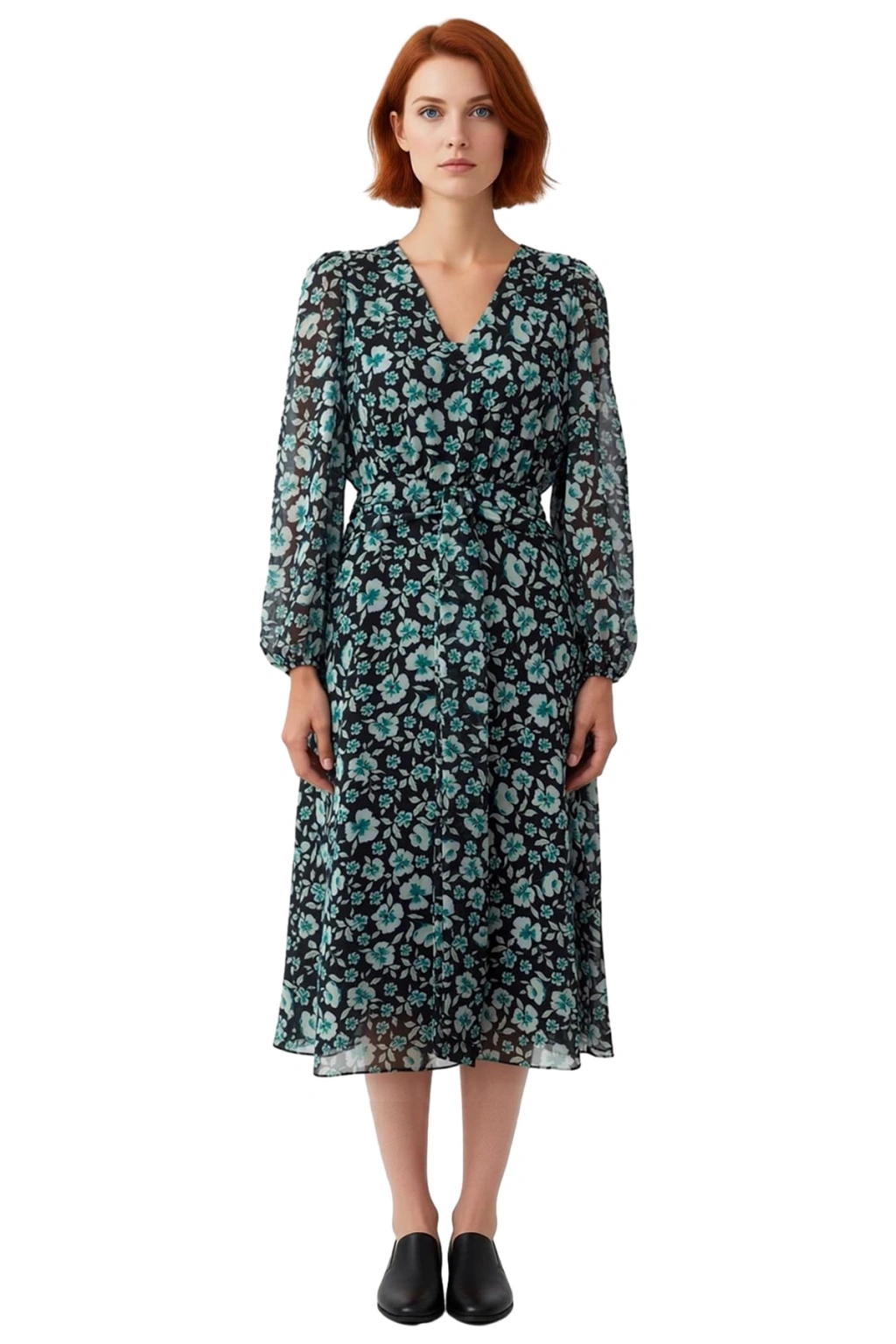 Ürün Özellikleri: A-line kalıp, %100 polyester materyal, çiçekli desen, V yaka, uzun balon kol, dokuma şifon kumaş, yeşil renk, kuşaklı detay, astarlı.