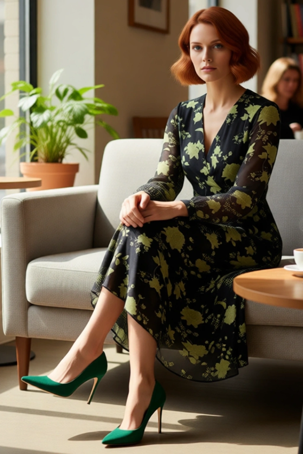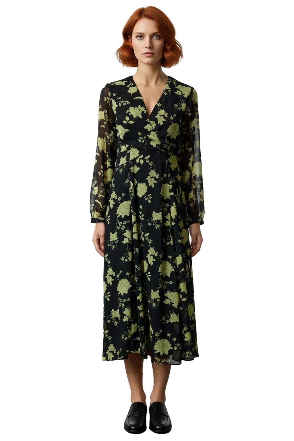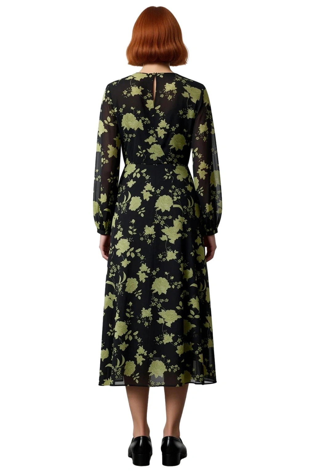 Ürün Özellikleri: A-line kalıp, polyester materyal, çiçekli desen, V yaka, standart kol, şifon kumaş, siyah renk, astarlı tasarım.