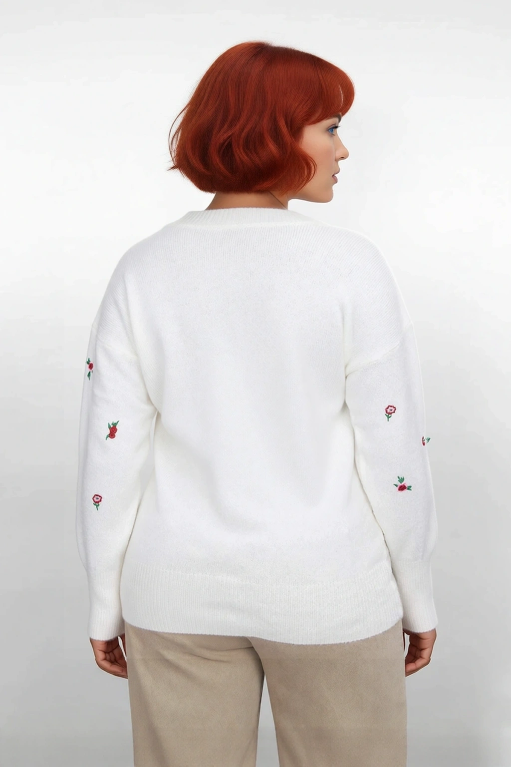 Ürün Özellikleri: Regular kalıp, akrilik polyester materyal, çiçekli desen, bisiklet yaka, standart uzun kol, triko kumaş, ekru renk, orta kalınlık.
