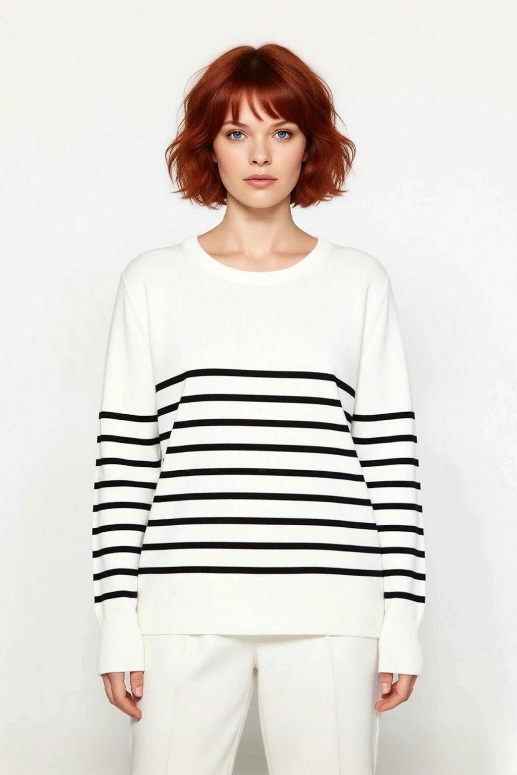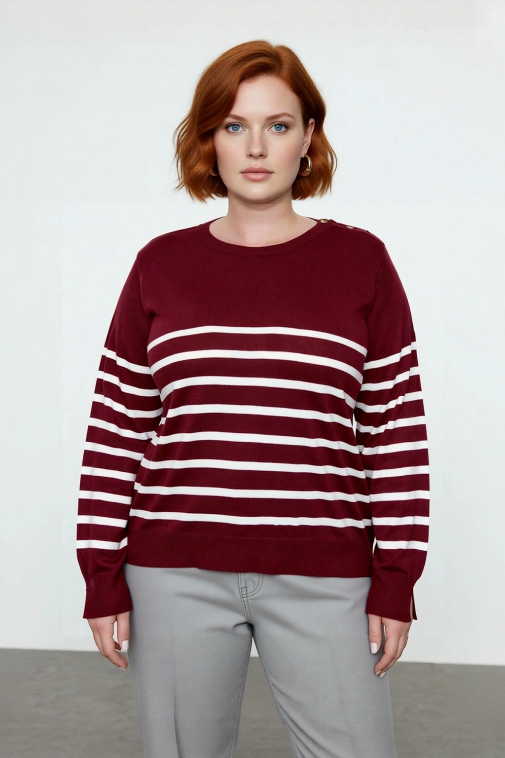 Ürün Özellikleri: Relaxed kalıp, akrilik materyal, çizgili desen, bisiklet yaka, standart kol, triko kumaş, bordo renk.