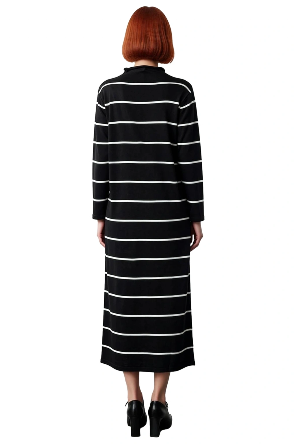Kadın Maxi Boy Çizgili Dik Yaka Triko Elbise, soğuk havalarda bile şıklığından ödün vermek istemeyen kadınlar için tasarlandı. Yüksek kaliteli 100% akrilik materyali sayesinde vücudunuzu sıcacık tutarken, aynı zamanda son derece yumuşak bir dokunuş sunar. A-line kalıbı, feminen silueti vurgularken her bedene uyum sağlayarak hareket özgürlüğü sunar. Çizgili deseni ve zarif gül kurusu rengi ile bu elbise, günlük yaşamda ve özel anlarda modern bir duruş sergilemenizi sağlar.