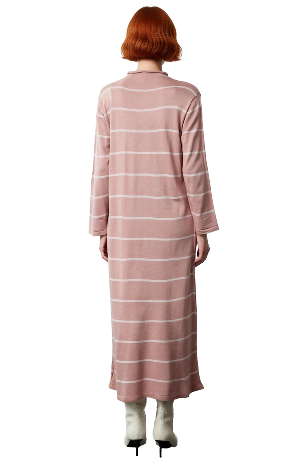Ürün Özellikleri: A-line kalıp, akrilik materyal, çizgili desen, dik yaka, standart kol, triko kumaş, gül kurusu renk.