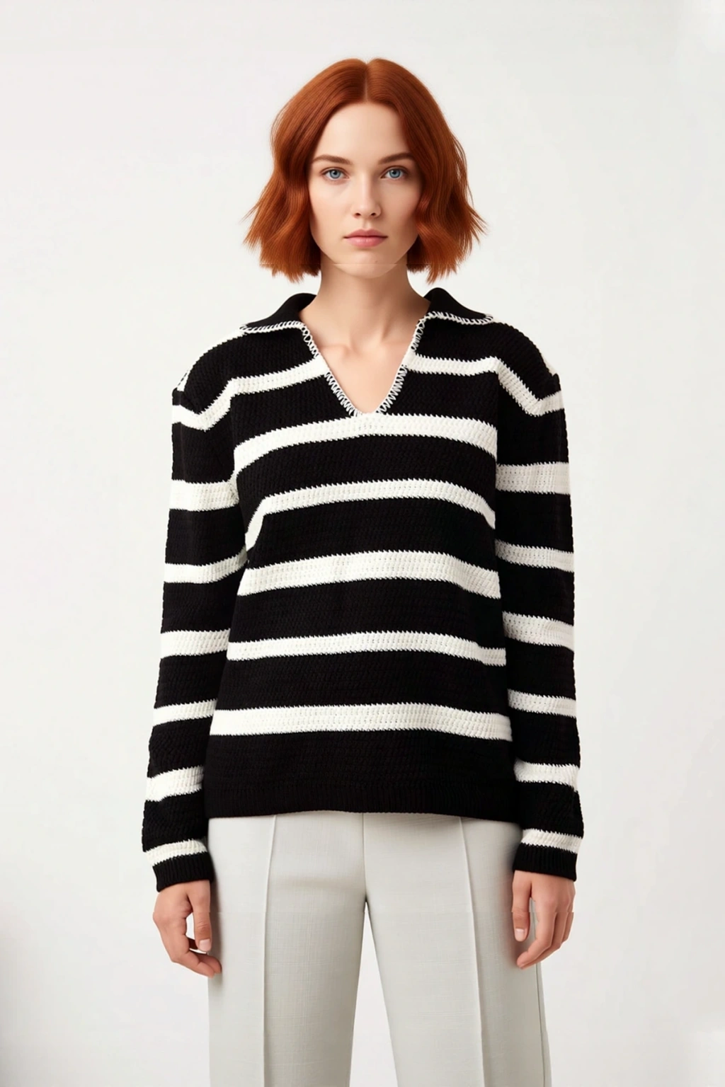 Ürün Özellikleri: Oversize kalıp, akrilik materyal, çizgili desen, polo yaka, düşük kol, triko kumaş, siyah renk, basic siluet.