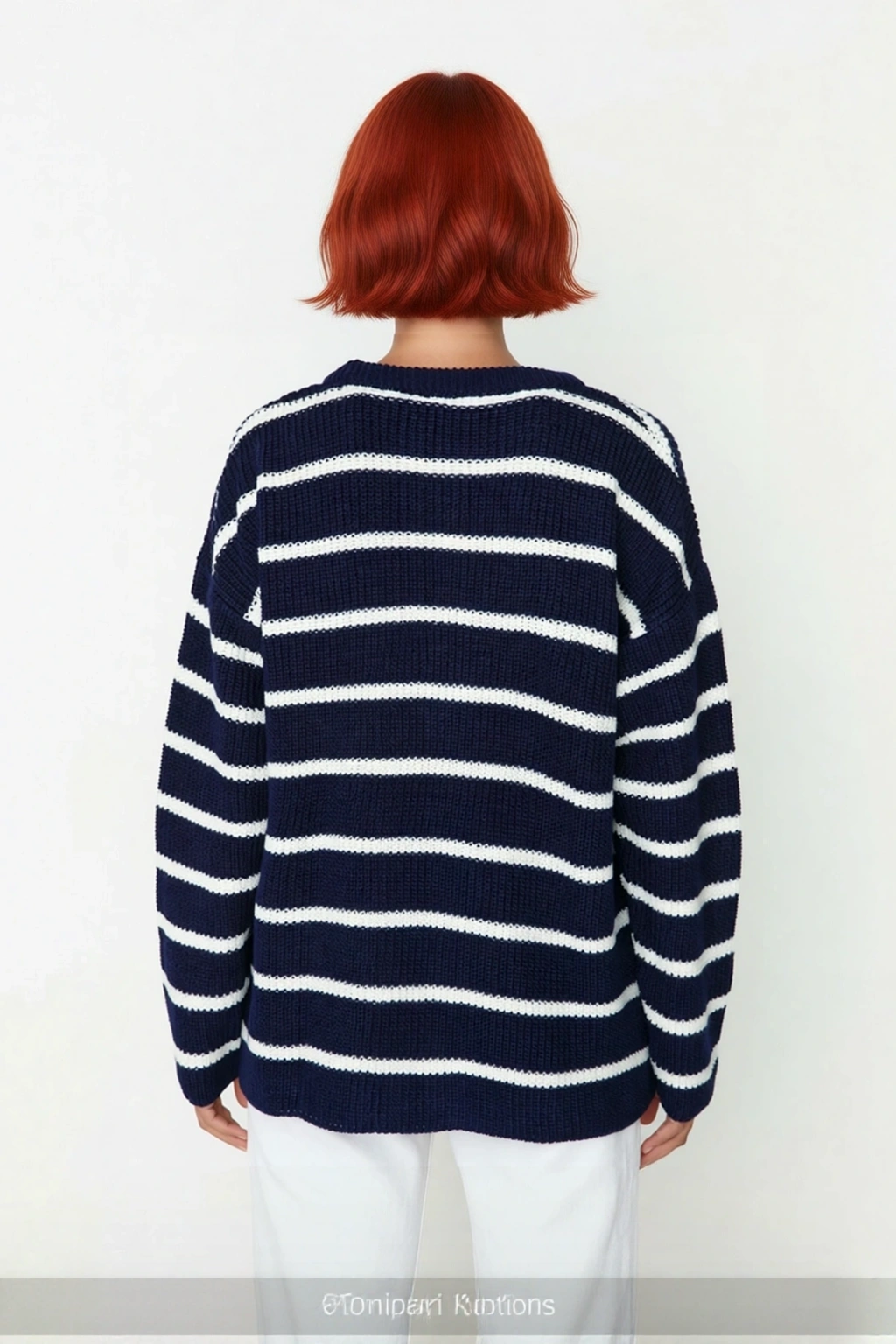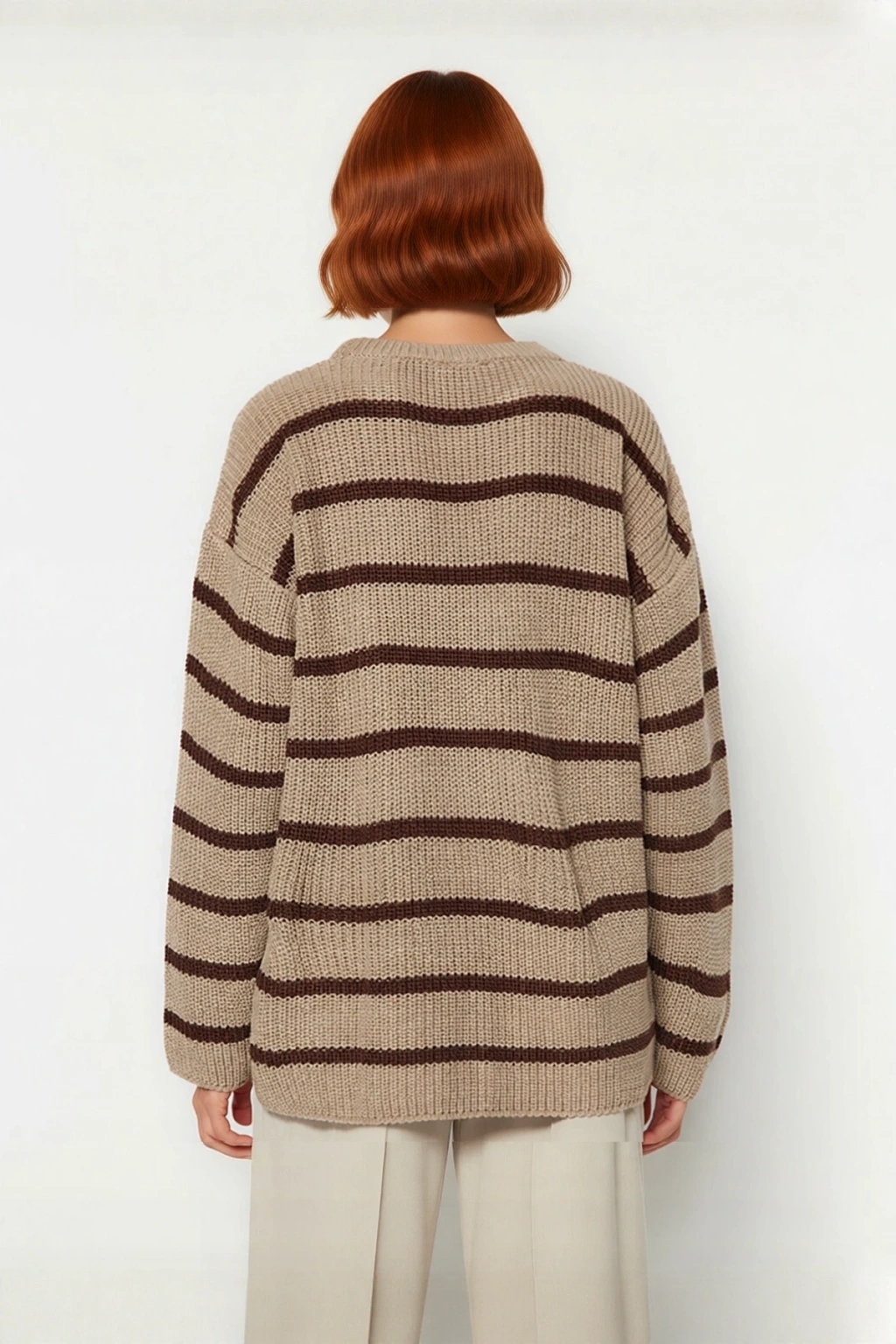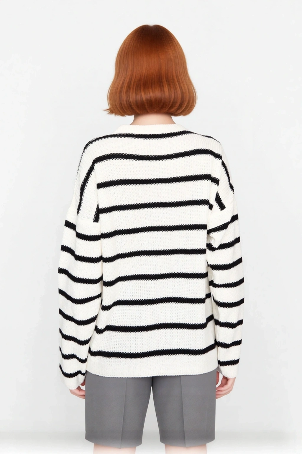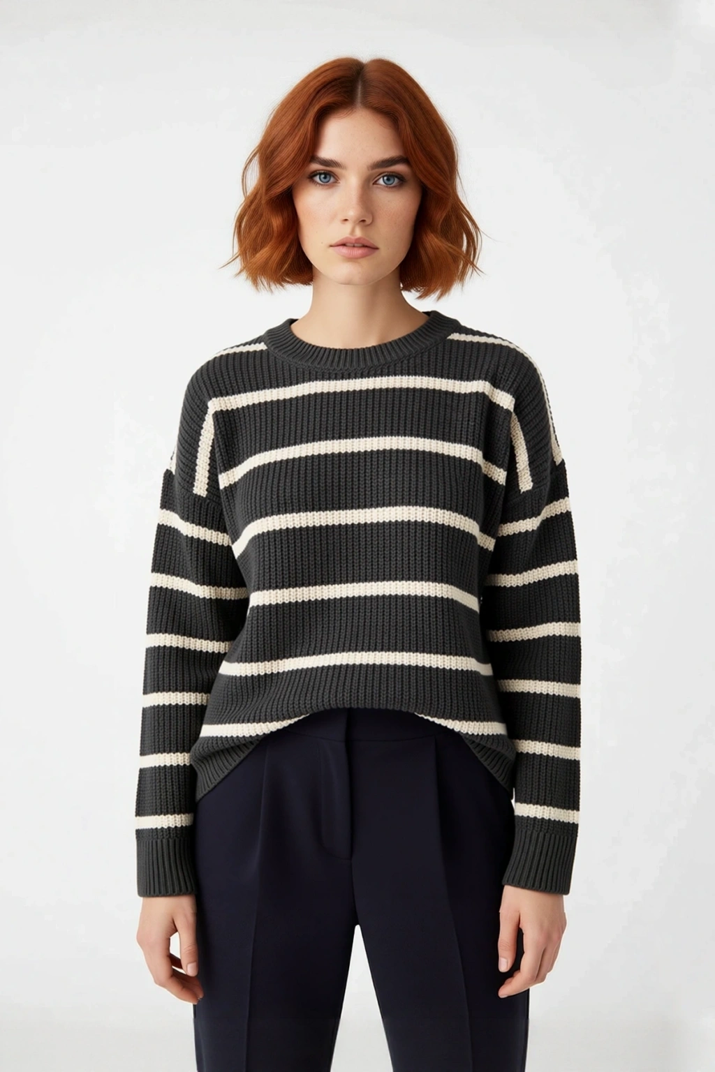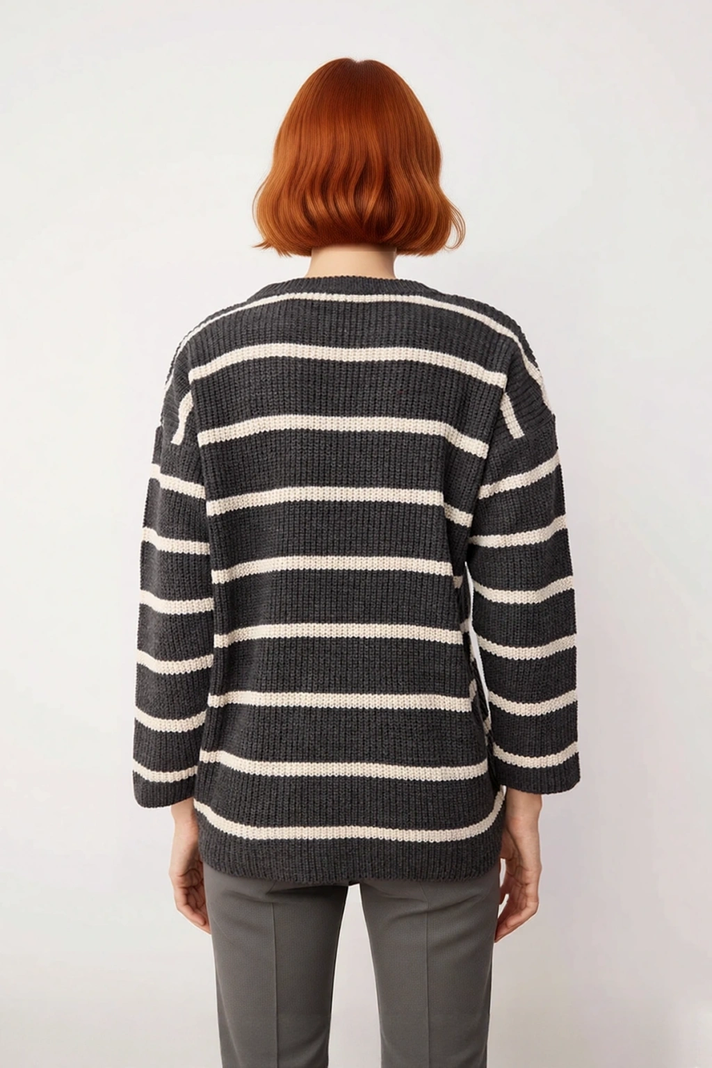 Ürün Özellikleri: Oversize kalıp, akrilik materyal, çizgili desen, bisiklet yaka, standart kol, triko kumaş, gri renk, basic siluet.