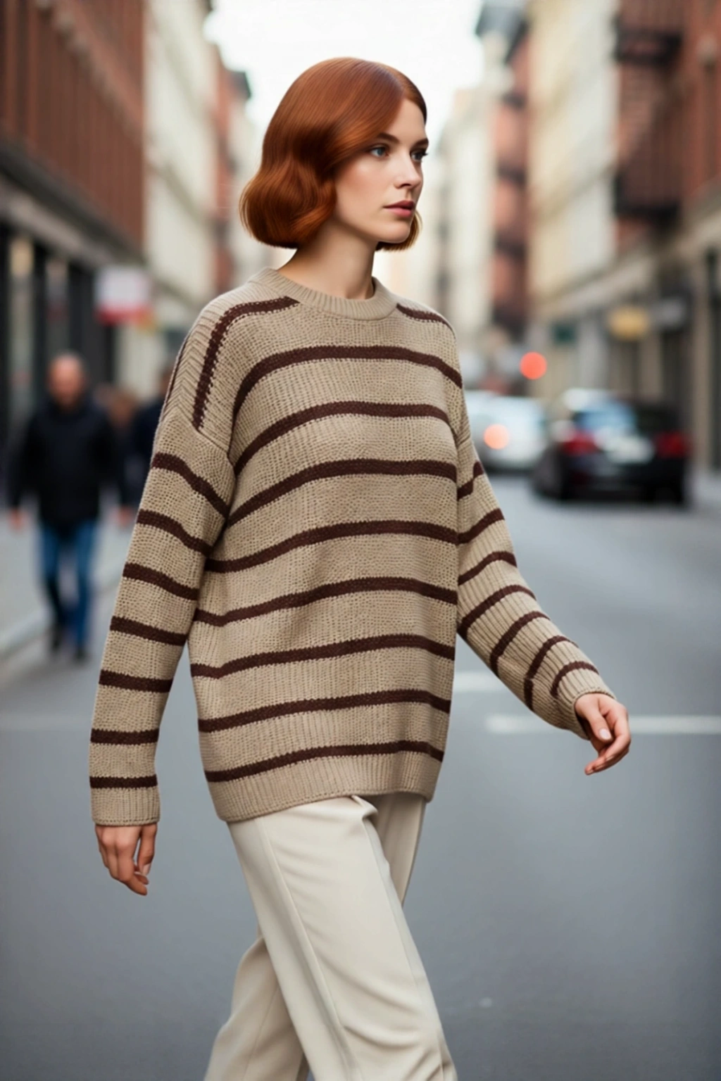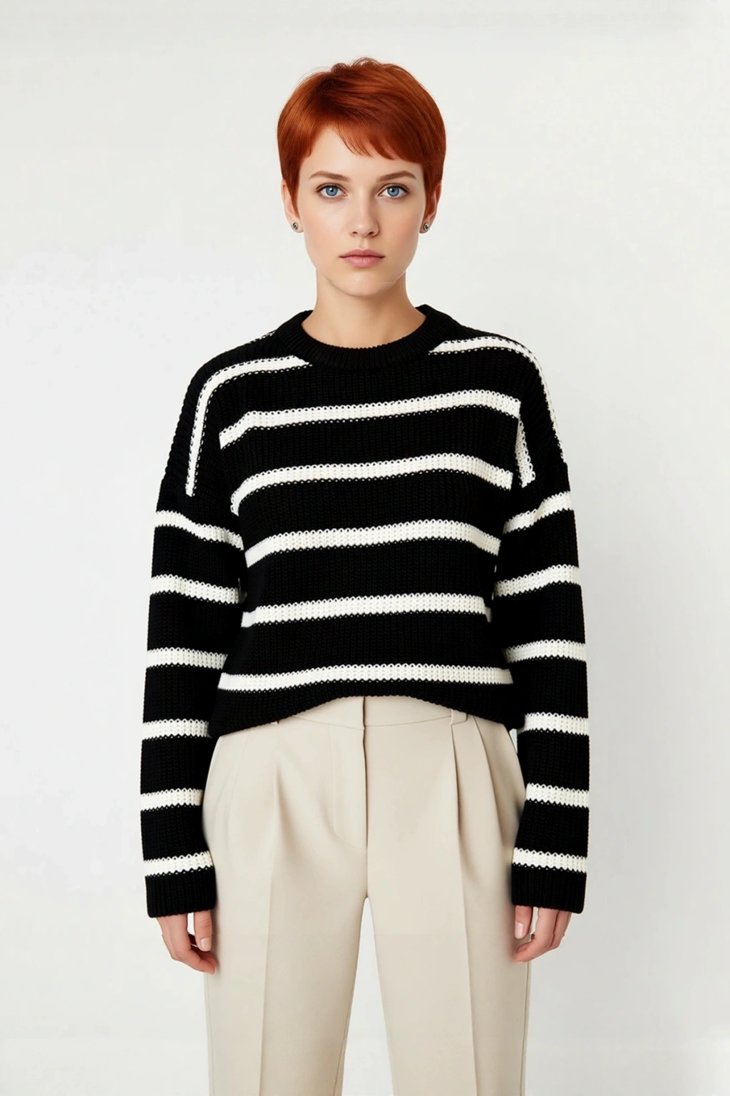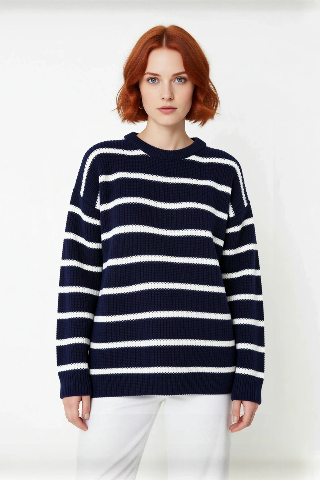 Bu zarif kadın çizgili oversize triko kazak, kış ve sonbahar aylarında hem şık hem de sıcacık kalmak isteyenler için tasarlandı. Geniş kalıbı, modern ve rahat bir siluet çizerken, vücut hatlarını nazikçe örterek her bedene uyum sağlar. Üstün kaliteli akrilik materyali, soğuk hava koşullarına karşı etkili bir koruma sunarken, gün boyu süren yumuşaklık ve konfor hissi verir. Gri rengin sakin tonları ile belirgin çizgili deseni, minimalist ve aynı zamanda dinamik bir stil yaratarak her kombine kolayca eşlik eder. Basic silueti ile gardırobunuzun temel parçalarından biri olacak.