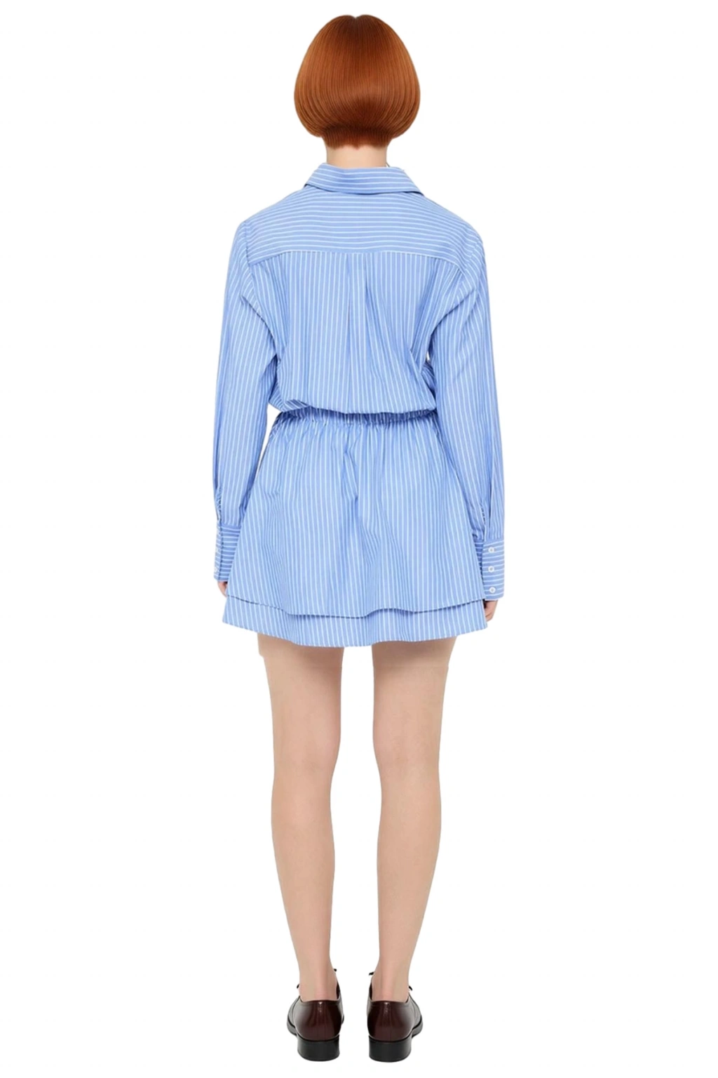 Ürün Özellikleri: Gömlek elbise kalıp, pamuk polyester karışımı, çizgili desen, gömlek yaka, düşük kol, uzun kol, poplin dokuma kumaş, mavi renk, mini boy, skater siluet, astarsız, bel lastik detaylı, yarım pat düğme kapama.