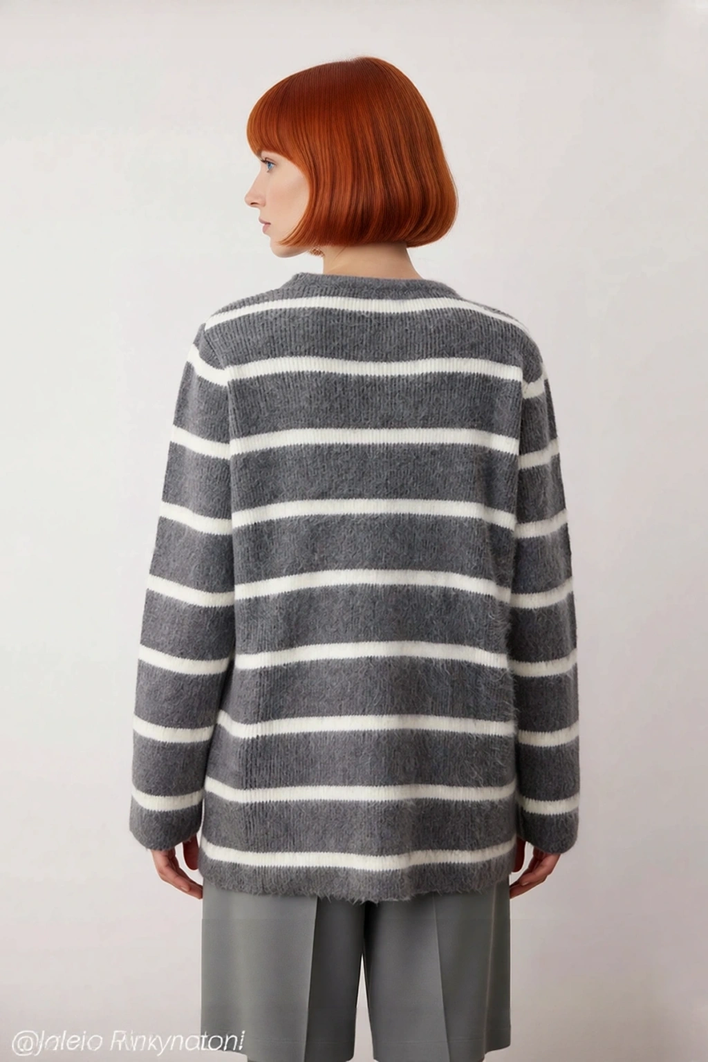 Bu sofistike kadın kazak, şık çizgili deseni ve modern regular kalıbıyla dikkat çeker. Vücudu nazikçe saran ama asla sıkmayan bu kesim, gün boyu süren bir konfor sunar. Yüksek kaliteli %100 akrilik materyalden üretilen triko kumaşı, kış aylarının soğuğuna meydan okurken, tüylü dokusuyla ekstra sıcaklık ve yumuşaklık sağlar. Gri rengin asil duruşu, tesettür giyim tarzına modern bir yorum getirirken, Cool & Comfort personasını yansıtan tasarımıyla hem şık hem de rahat hissetmenizi garantiler.