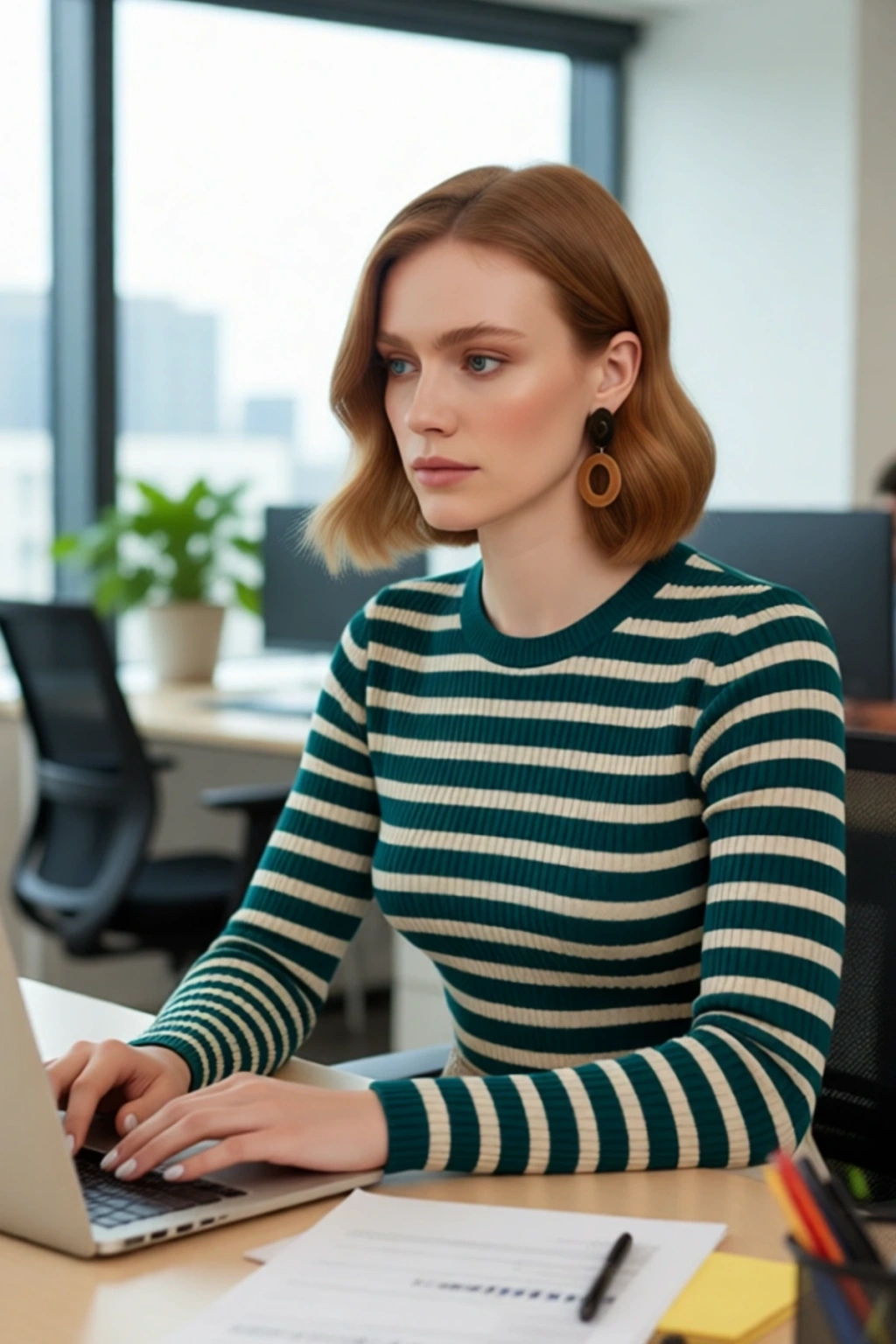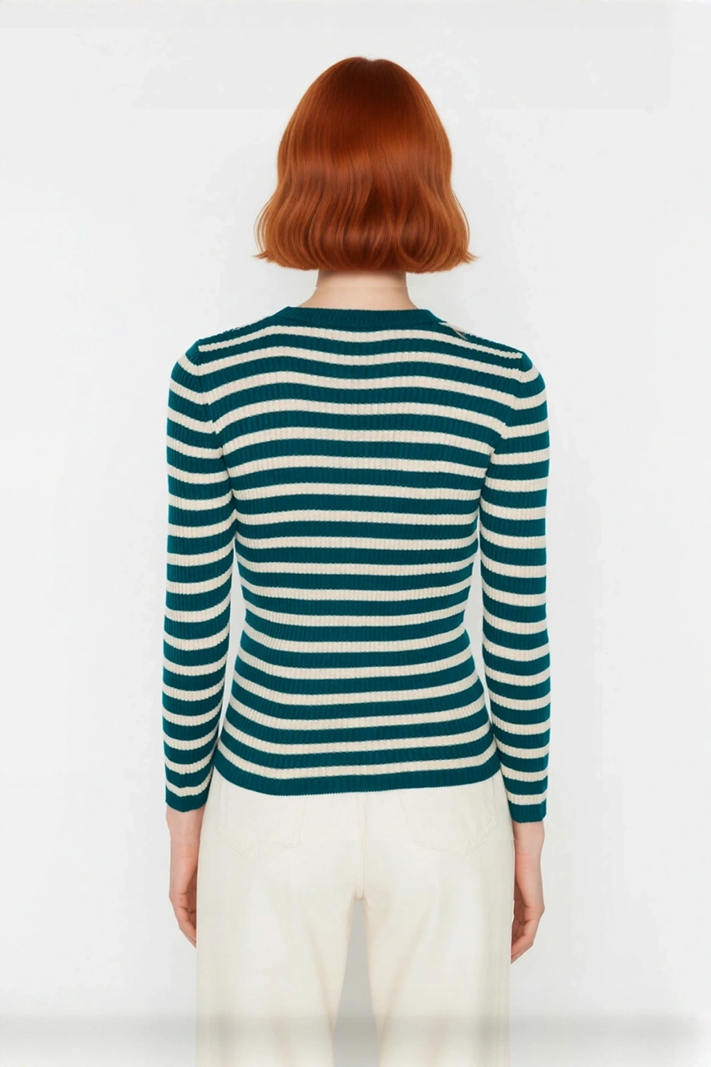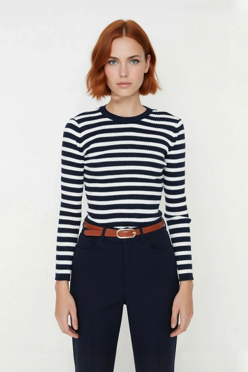 Kadın Çizgili Triko Fitted Uzun Kol Bisiklet Yaka Akrilik Basic Casual Günlük Kazak, modern kadının gardırobuna zarafet ve rahatlık katmak için tasarlandı. Vücuda tam oturan fitted kalıbı ile şık bir duruş sergileyen bu kazak, %100 akrilik materyali sayesinde yumuşacık bir dokunuş ve soğuk havalara karşı etkili bir koruma sağlar. Dikkat çekici çizgili deseni, basic koleksiyonun zamansız şıklığını yansıtırken, kahverengi rengiyle günlük kombinlerinize sıcak bir hava katar. Baskısız ve sade tasarımı, minimalist stilin güçlü bir ifadesidir.
