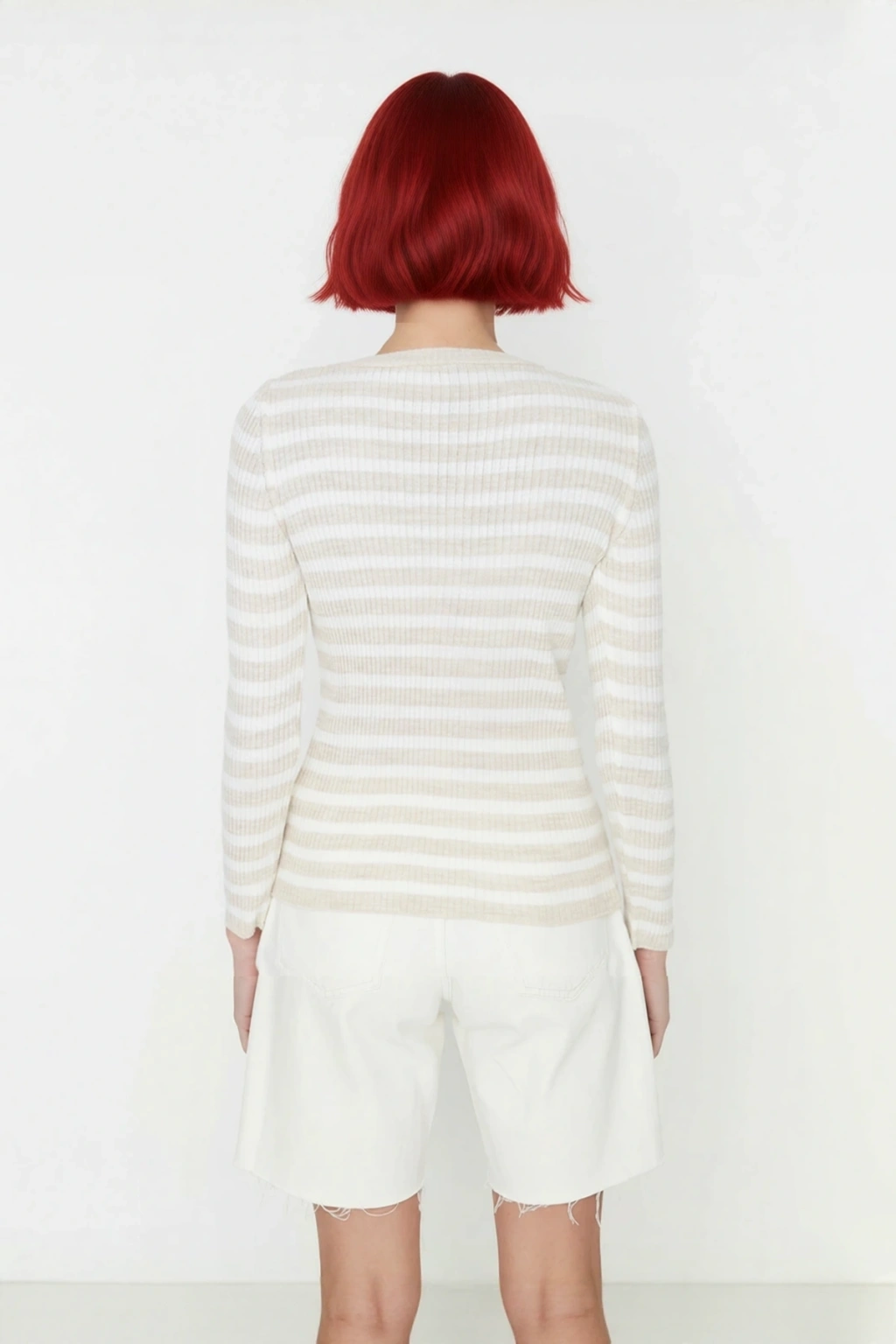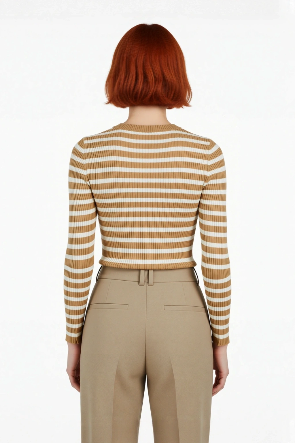 Ürün Özellikleri: Fitted kalıp, akrilik materyal, çizgili desen, bisiklet yaka, standart kol, triko kumaş, kahverengi renk.