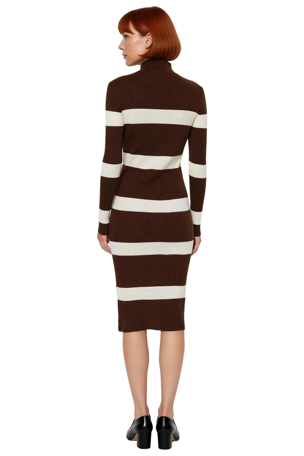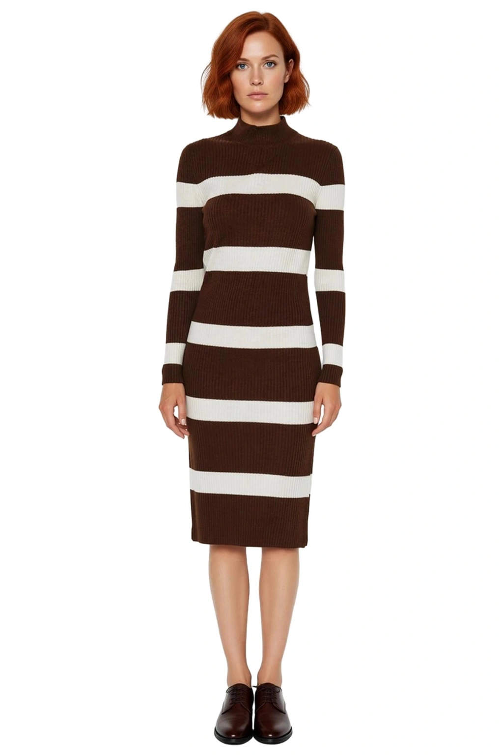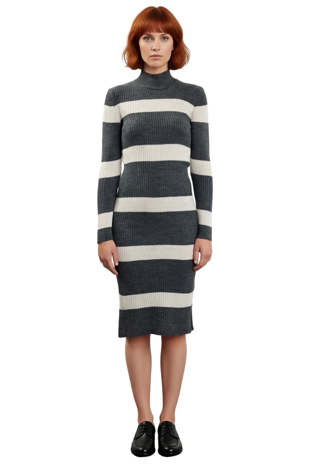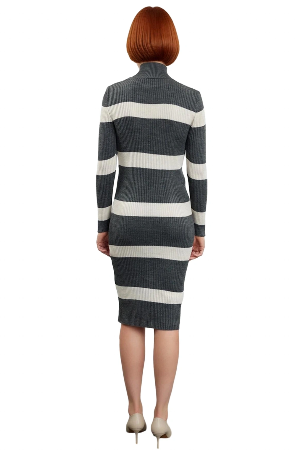 Ürün Özellikleri: Bodycon kalıp, akrilik materyal, çizgili desen, dik yaka, standart uzun kol, triko kumaş, antrasit ve ekru renk, ince kalınlık, midi boy.