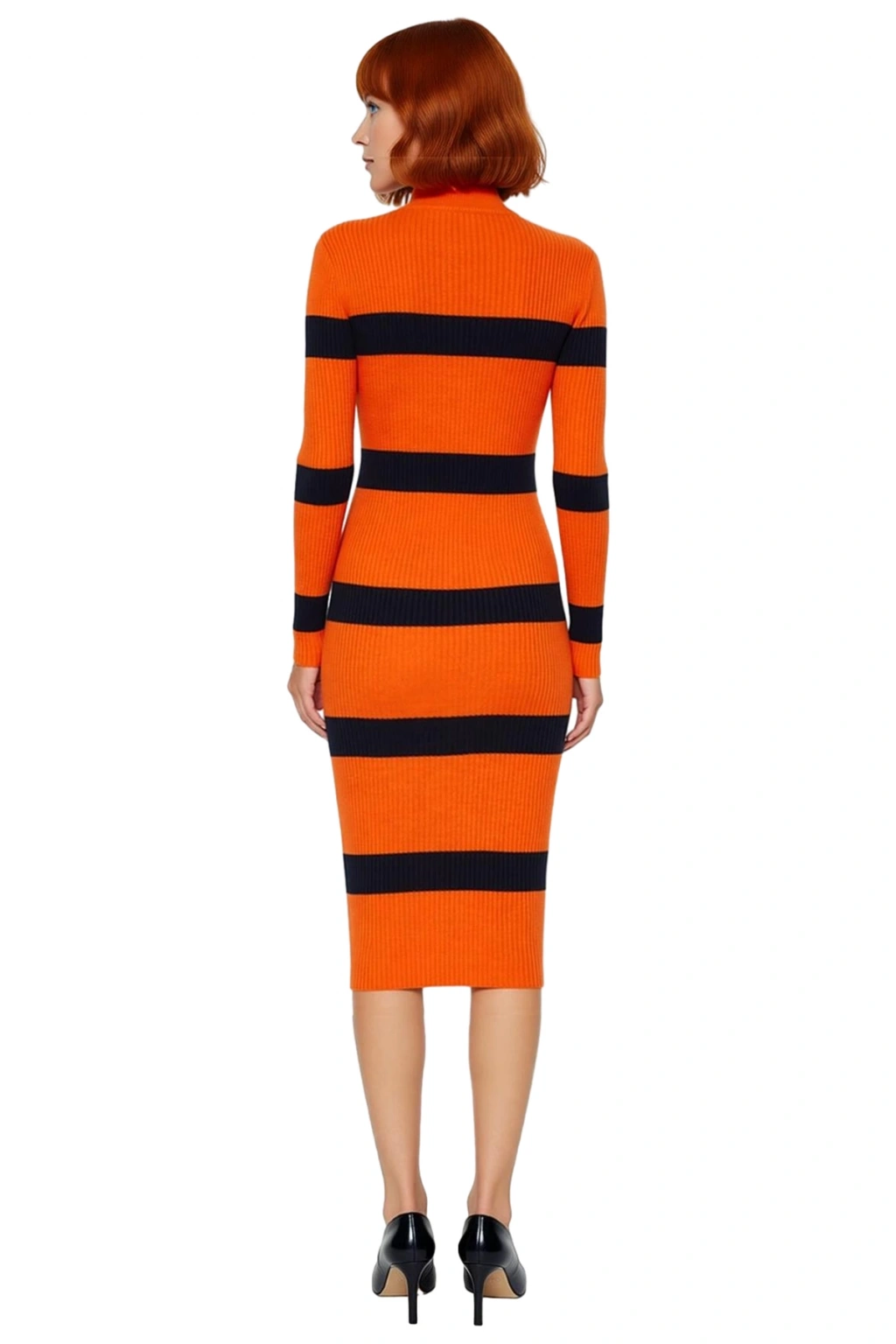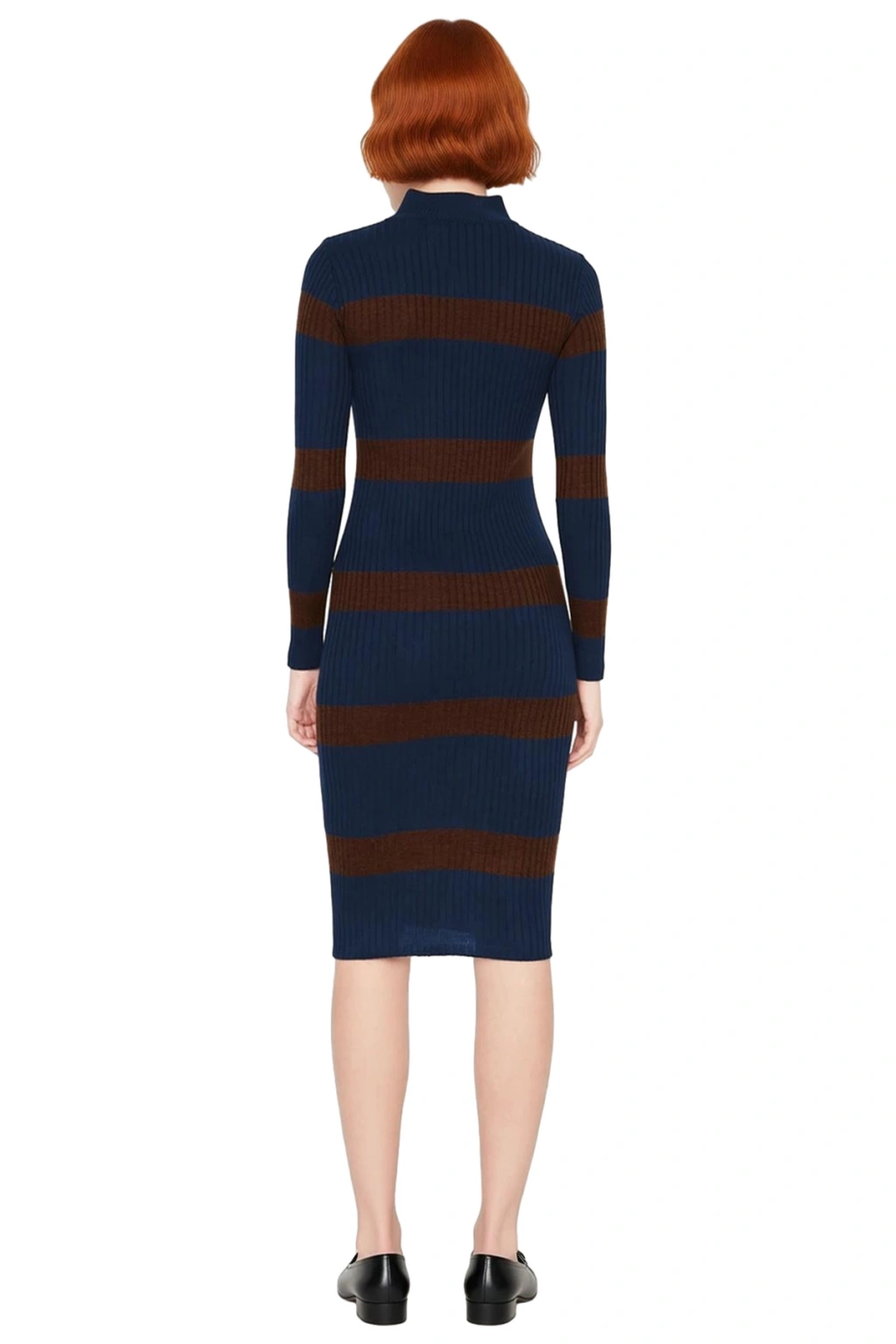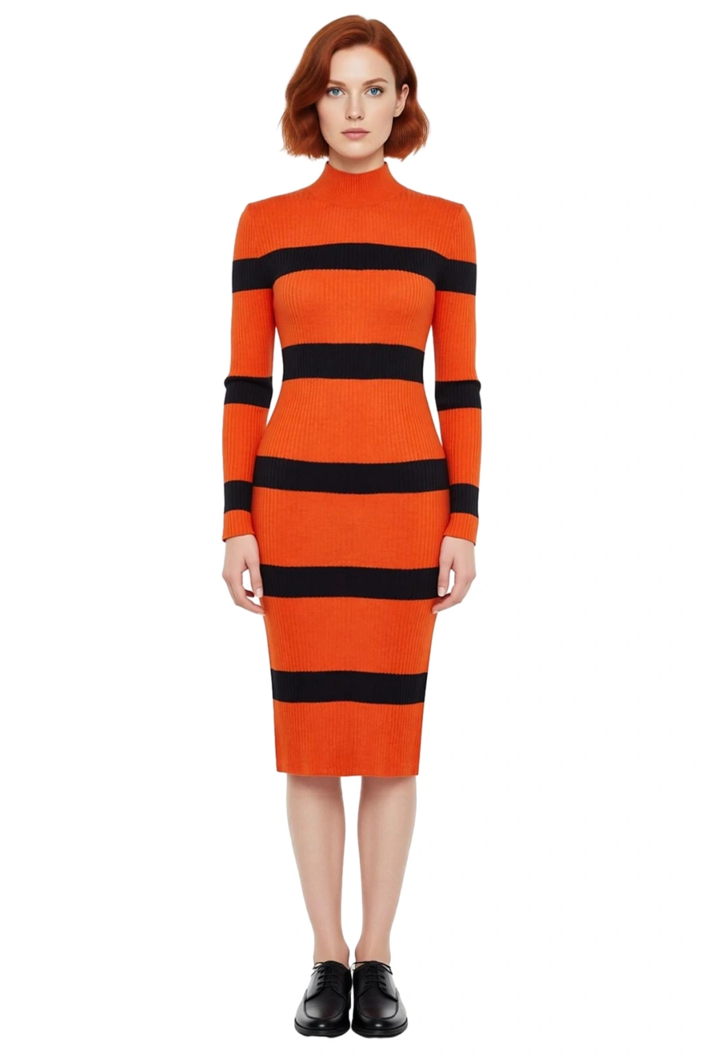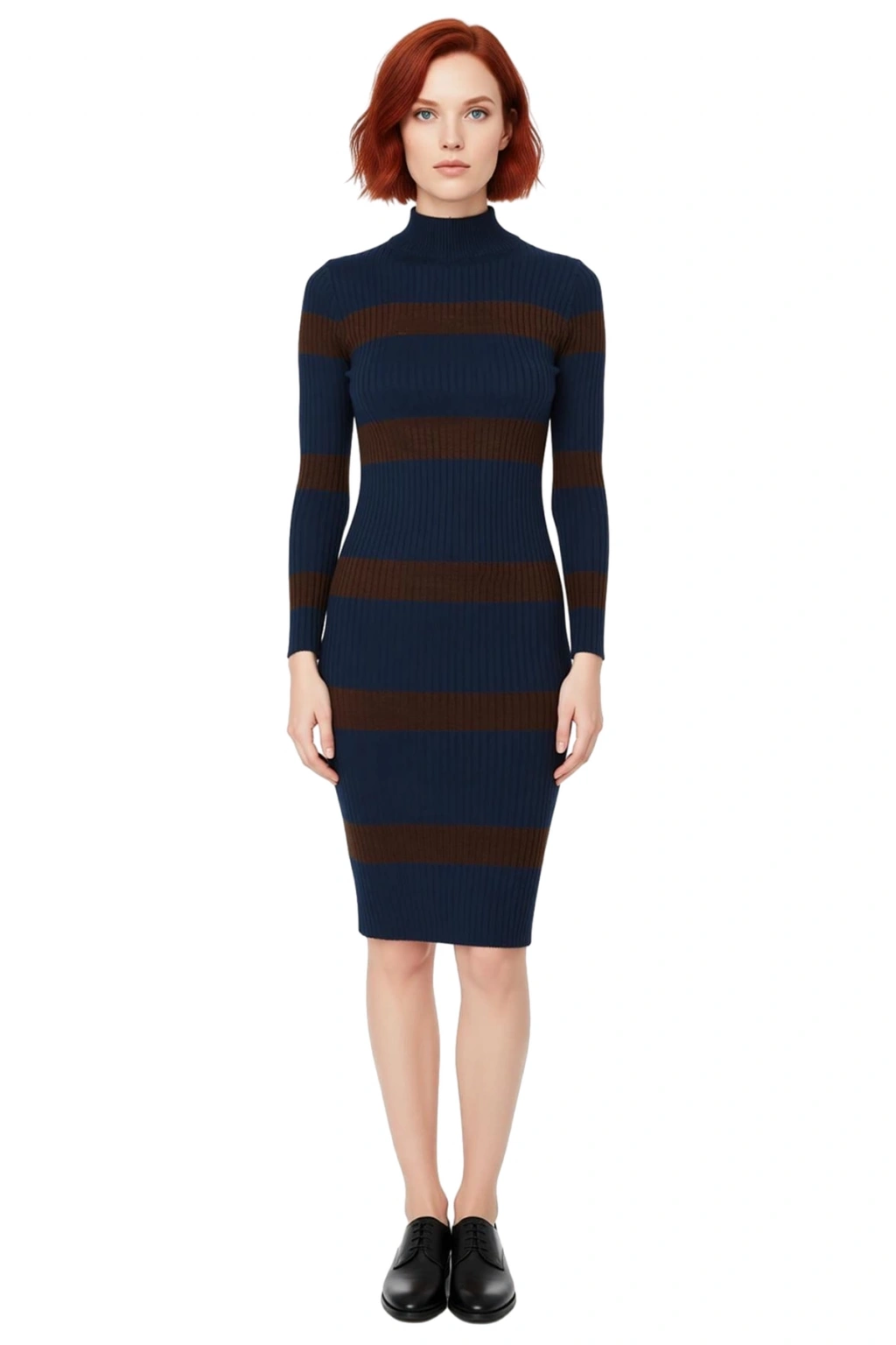 Ürün Özellikleri: Bodycon kalıp, akrilik materyal, çizgili desen, dik yaka, standart uzun kol, triko kumaş, antrasit ve ekru renk, ince kalınlık, midi boy.