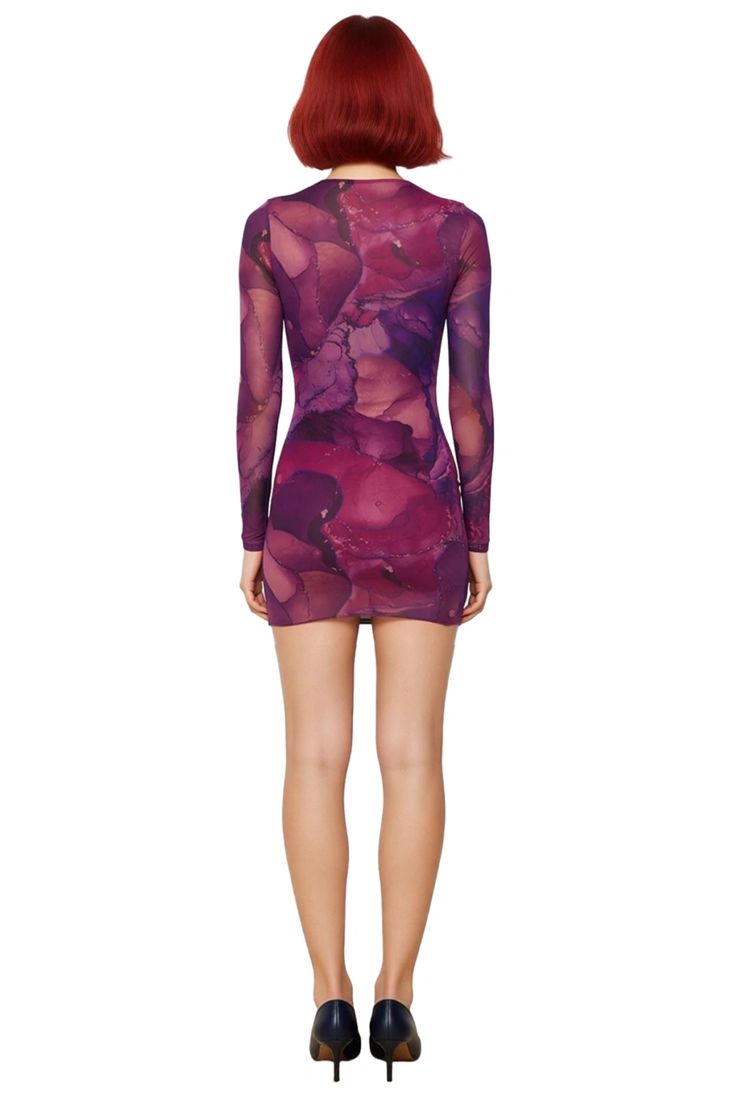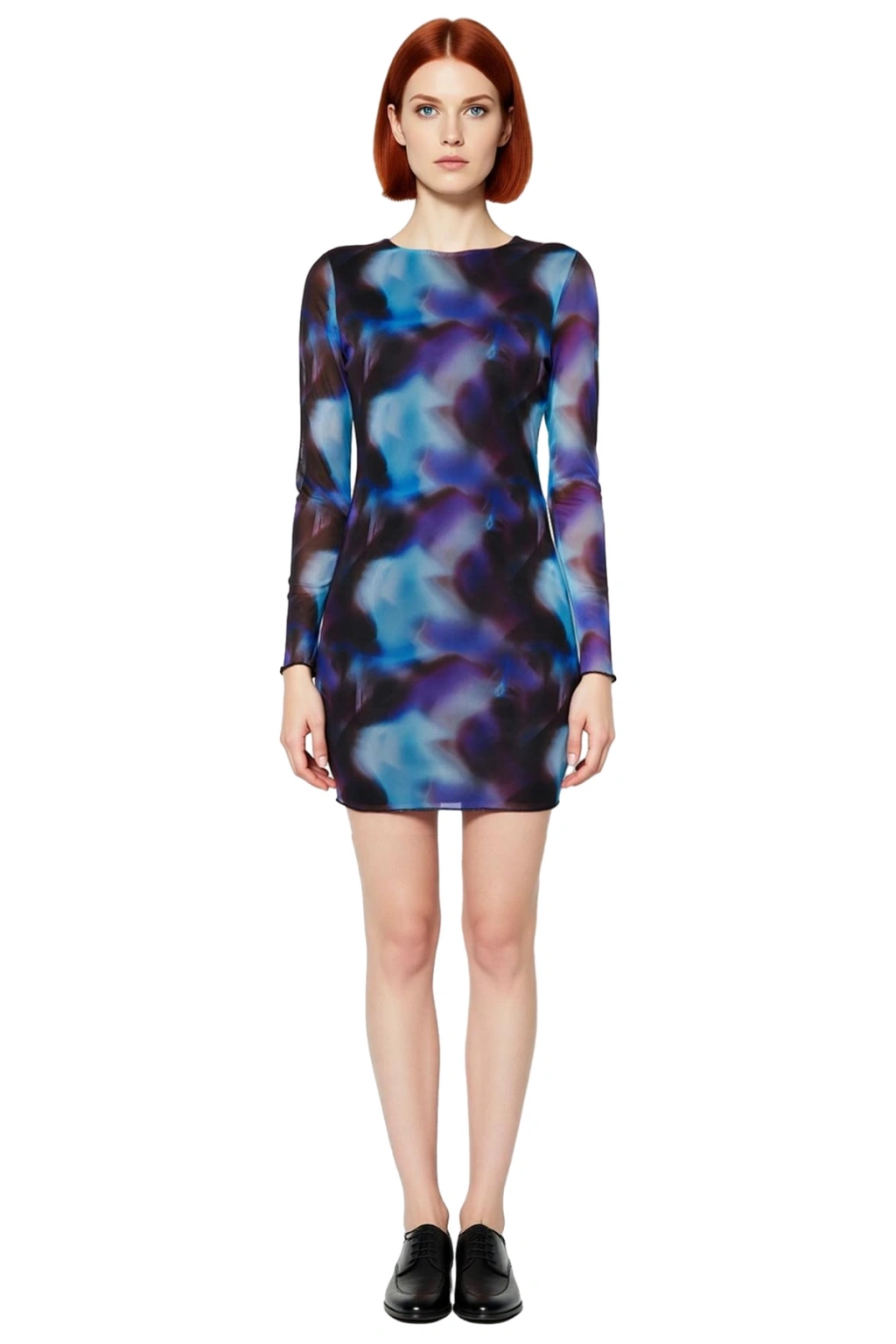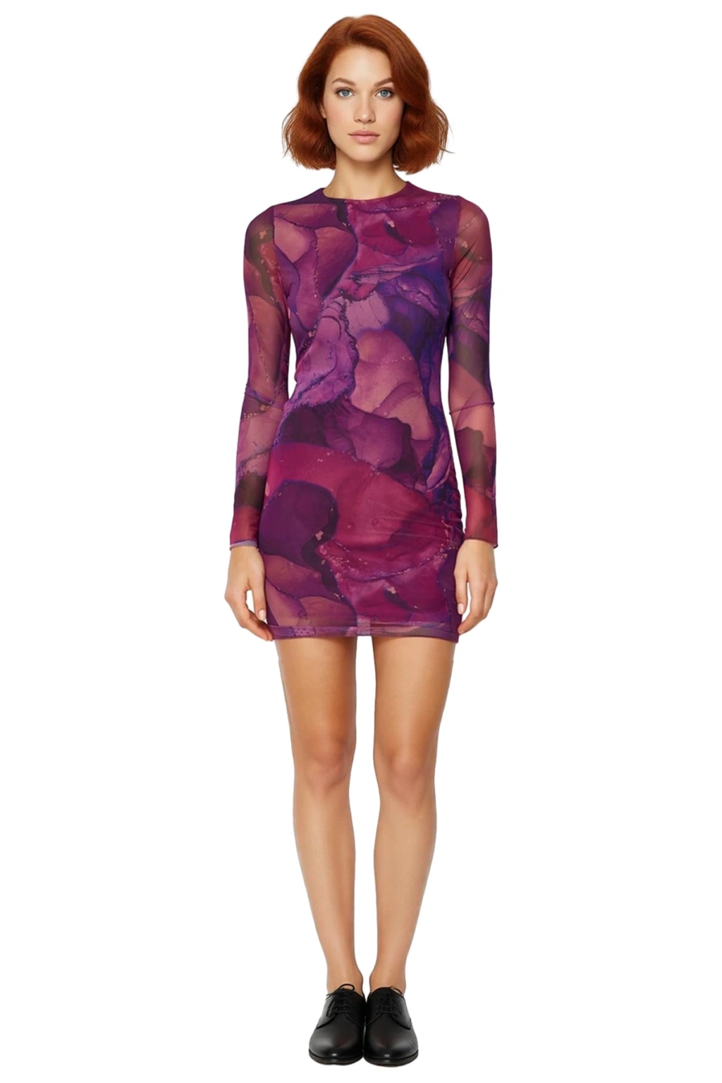 Ürün Özellikleri: Bodycon kalıp, polyester karışımlı materyal, soyut desen, bisiklet yaka, standart kol, örme tül kumaş, çok renkli.