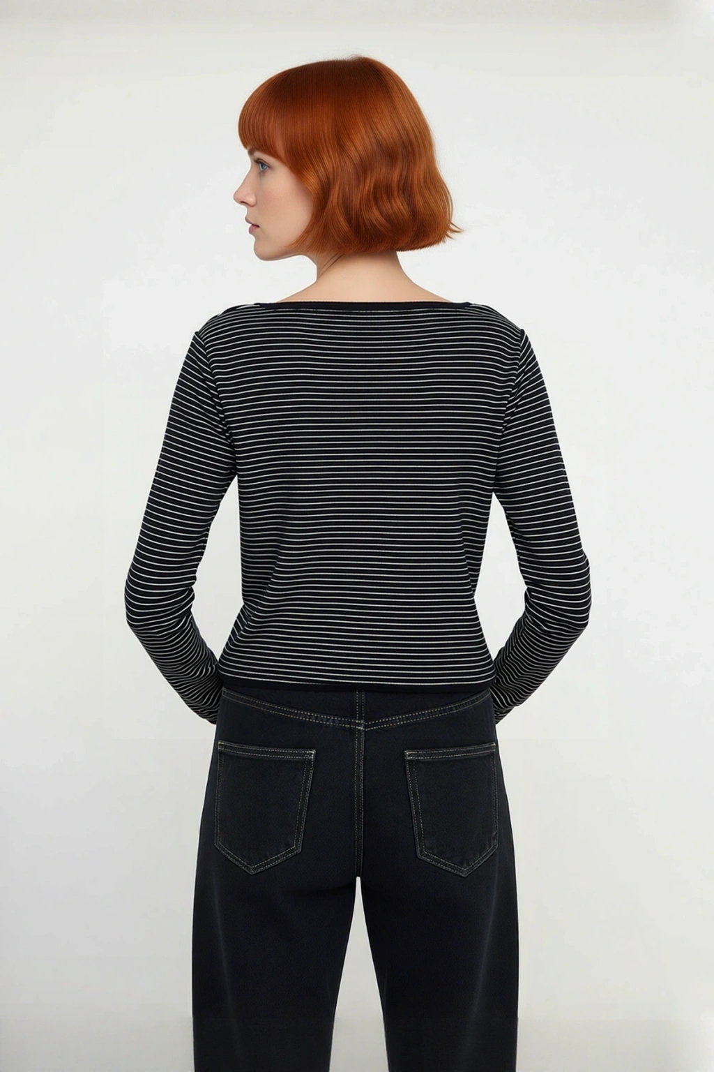 Ürün Özellikleri: Regular kalıp, viskoz-polyester-poliamid materyal, çizgili desen, bisiklet yaka, standart kol, triko kumaş, siyah renk.