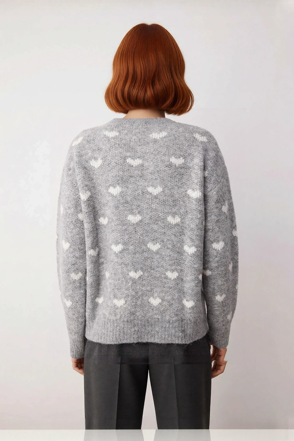 Ürün Özellikleri: Oversize kalıp, akrilik yün karışımlı materyal, kalp desen, bisiklet yaka, düşük kol, triko kumaş, gri renk.