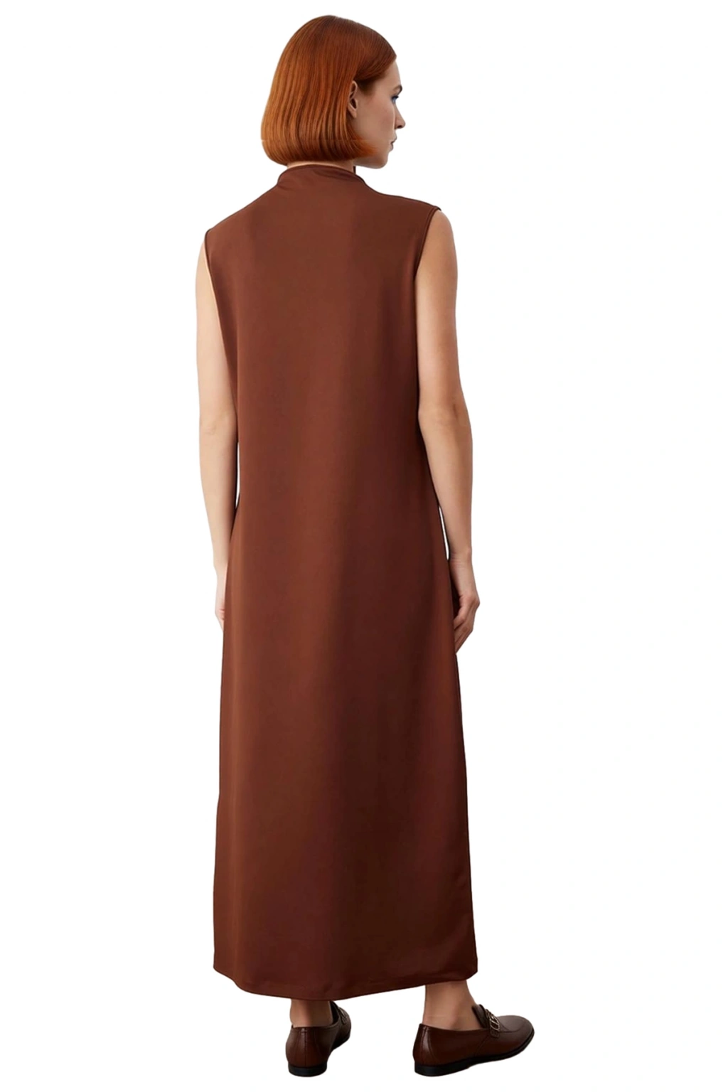 Ürün Özellikleri: Shift kalıp, polyester karışımlı materyal, düz desen, dik yaka, kolsuz, örme dalgıç kumaş, kahverengi renk, astarsız tasarım.