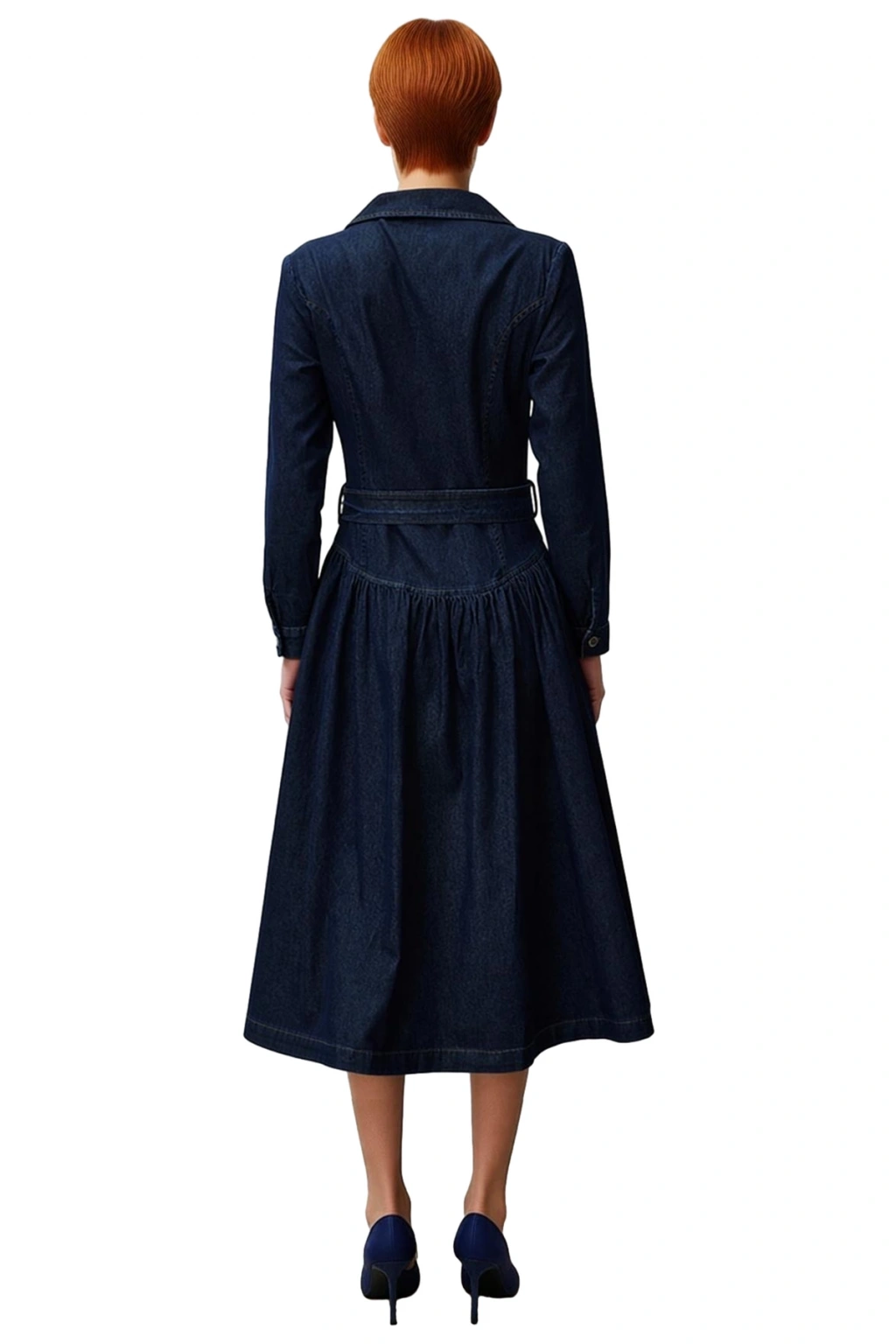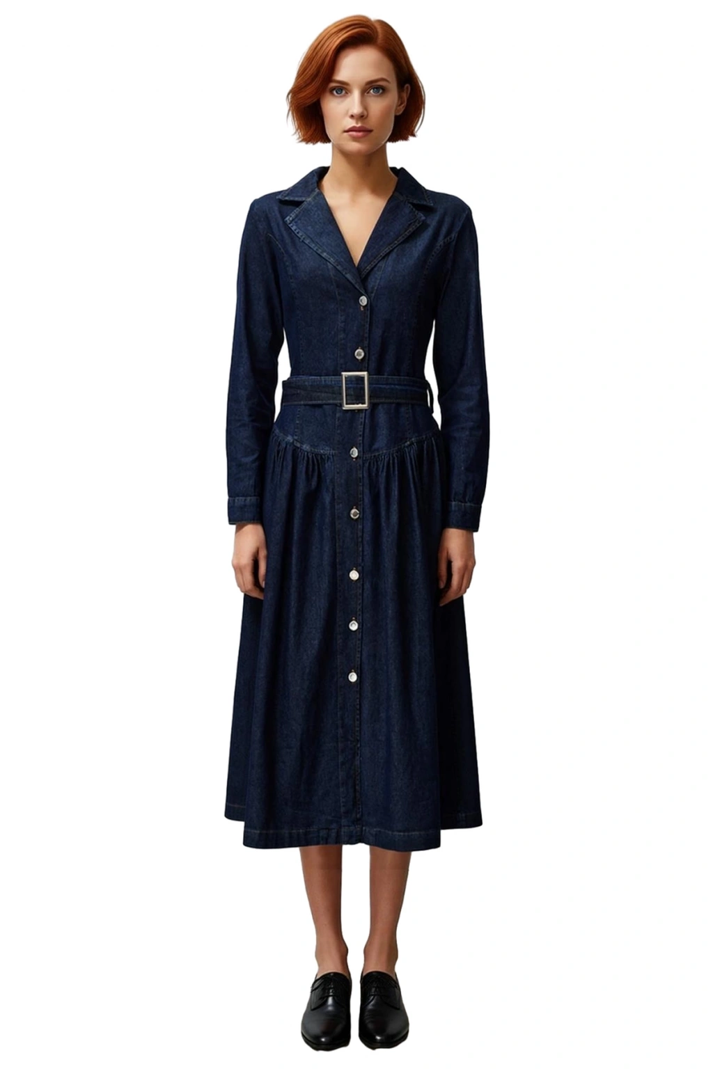 Ürün Özellikleri: Shift kalıp, %100 pamuk materyal, düz desen, ceket yaka, standart kol, denim kumaş, mavi renk, baskısız tasarım, kemerli.