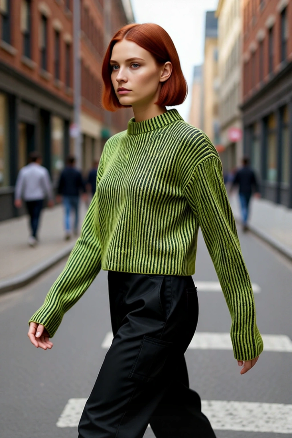 Bu modern crop kazak, regular kalıbı ile vücuda rahatça oturarak günlük şıklığınızı tamamlar. %78 akrilik ve %22 polyester materyal bileşimi sayesinde yumuşacık dokusuyla cildinize nazik davranırken, orta kalınlığıyla soğuk havalarda ideal sıcaklığı sunar. Yeşil ve siyah çizgili deseni dinamik bir görünüm kazandırırken, dik yaka tasarımı zarafetinizi ön plana çıkarır. Cool & Comfort personasına uygun yapısıyla gün boyu kendinizi iyi hissetmenizi sağlar.