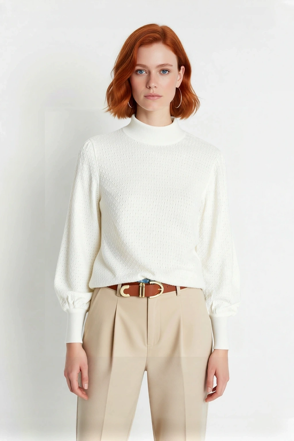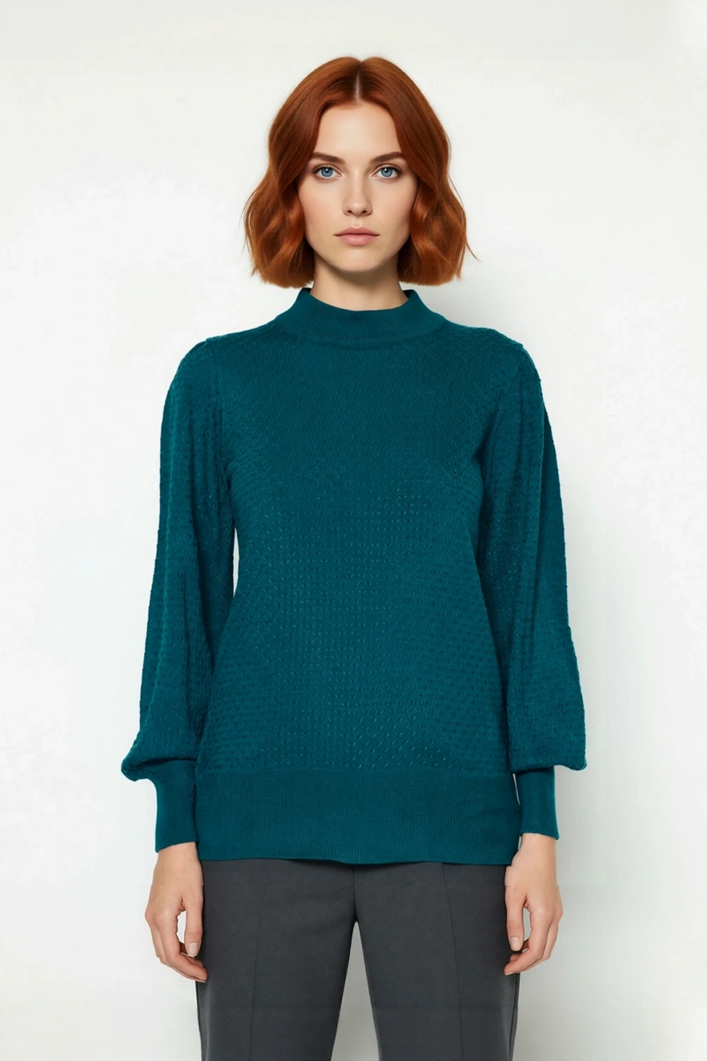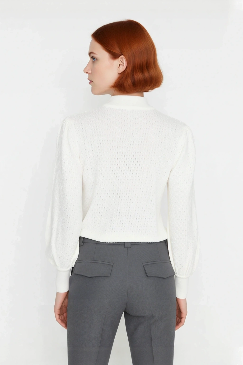 Ürün Özellikleri: Regular kalıp, akrilik materyal, dokulu desen, dik yaka, balon kol, triko kumaş, ekru renk.