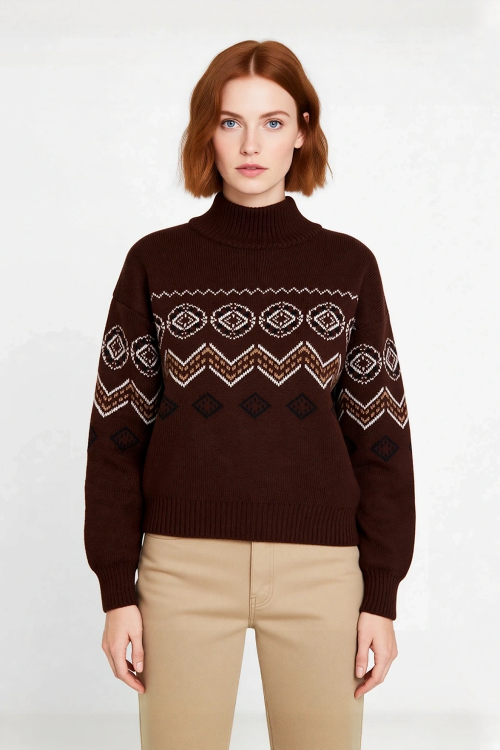 Ürün Özellikleri: Regular kalıp, akrilik polyester materyal, etnik desen, dik yaka, düşük kol, triko kumaş, kahverengi renk, uzun boy, pike dokuma.