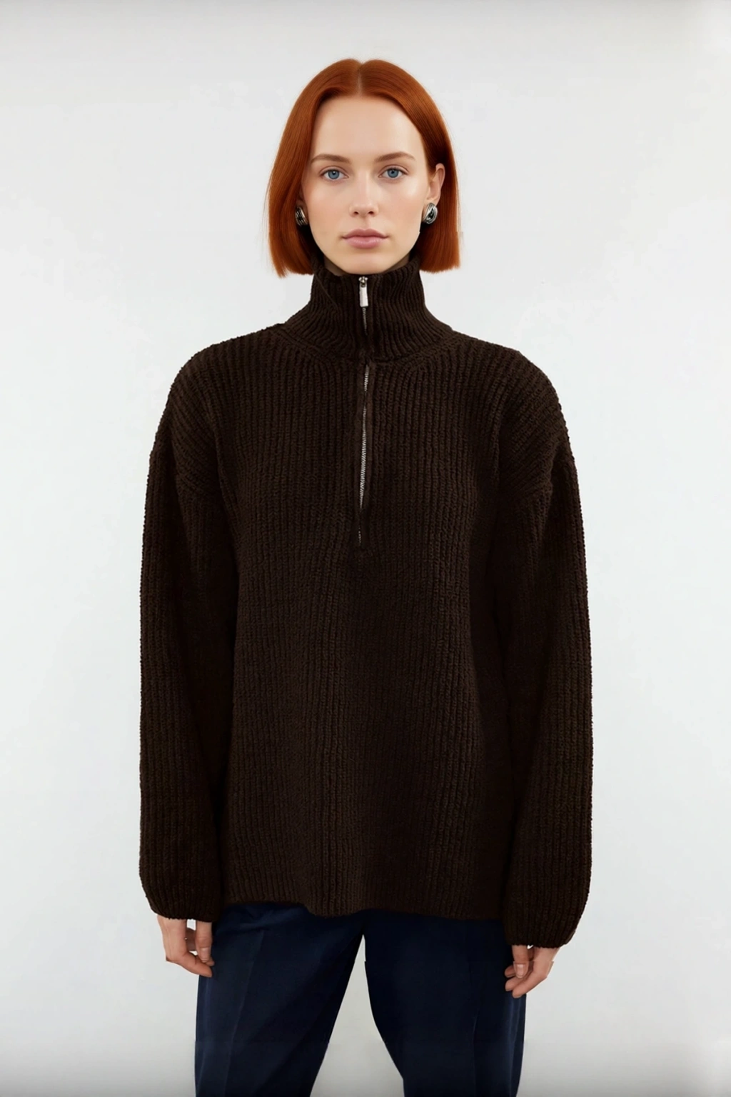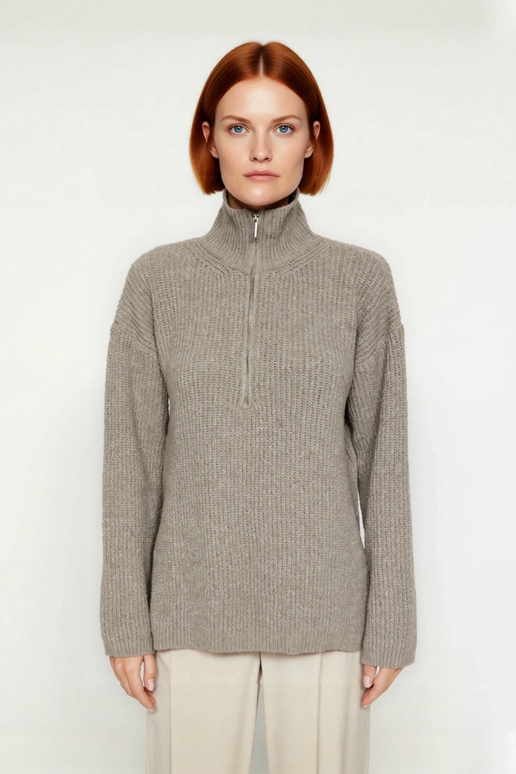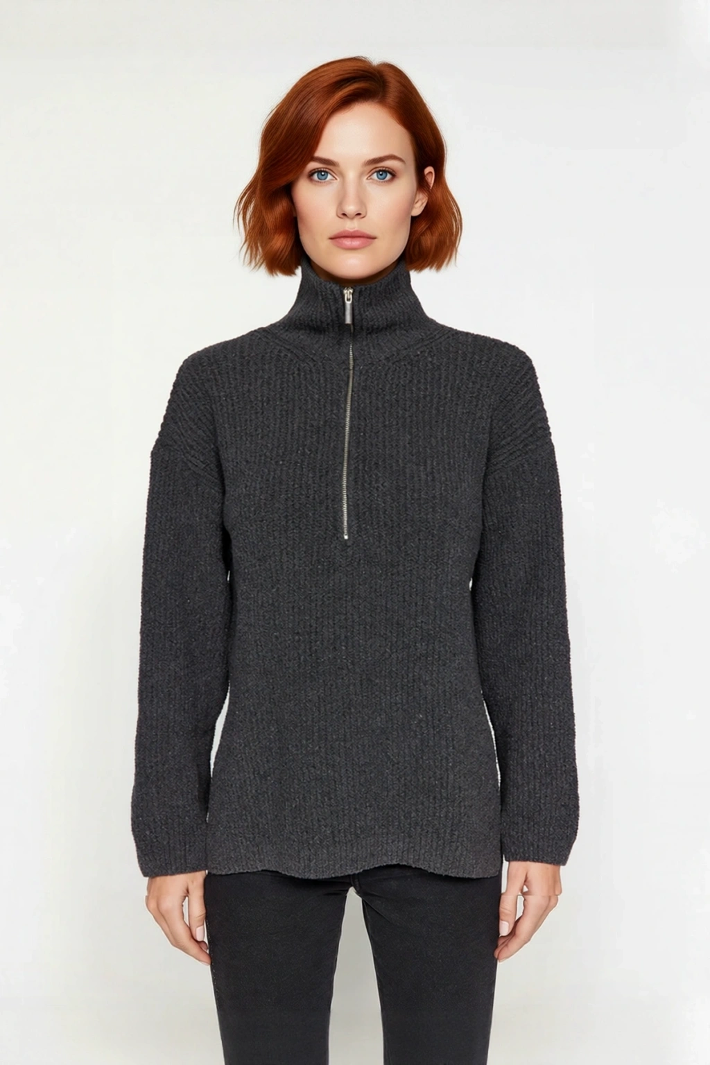 Bu şık ve konforlu Kadın Dik Yaka Fermuarlı Triko Kazak, soğuk kış günlerinde sıcaklığınızı korurken stilinizden ödün vermemenizi sağlar. Regular kalıbı sayesinde vücuda rahatça oturur, gün boyu hareket özgürlüğü ve üstün bir konfor sunar. Yüksek kaliteli polyester ve pamuk karışımı materyali, yumuşak dokunuşu ve dayanıklı yapısıyla öne çıkarak uzun süreli kullanım vadeder. Düz deseni modern ve minimalist bir görünüm yaratırken, antrasit rengi her türlü kombinle kolayca uyum sağlayarak gardırobunuzun vazgeçilmezi olmaya adaydır. Bu kazak, hem rahatlık hem de şıklığı bir arada arayan kadınlar için ideal bir seçimdir.