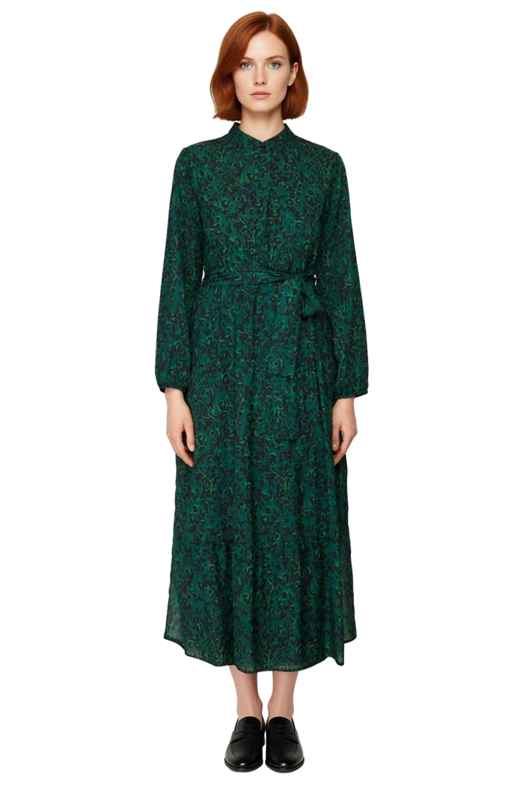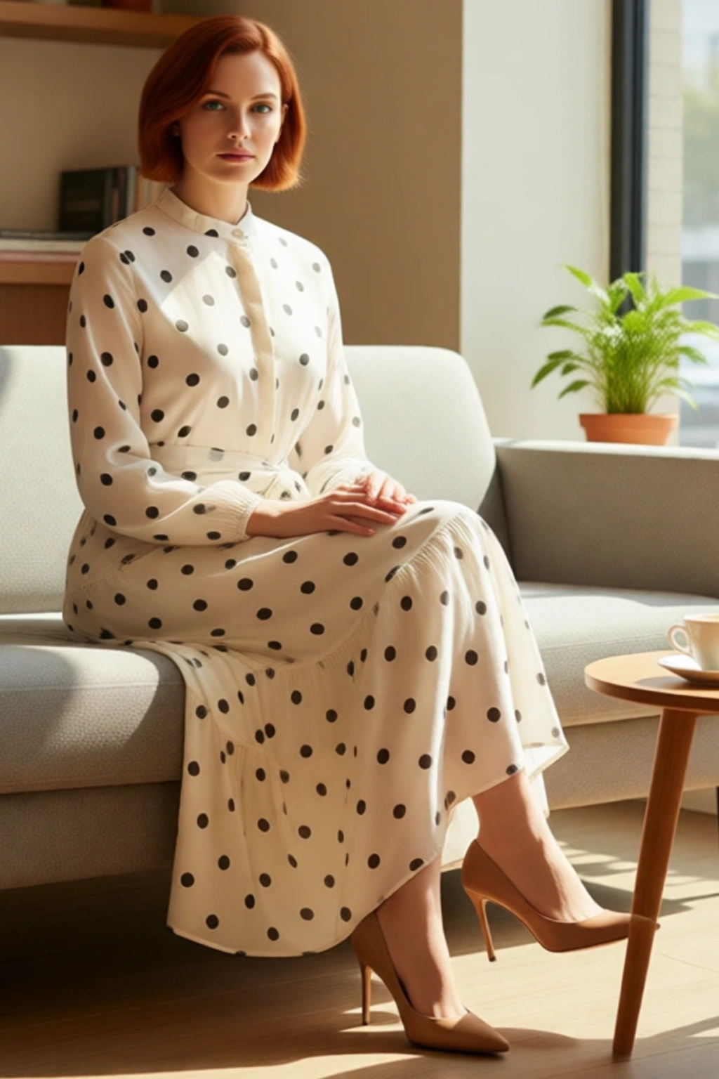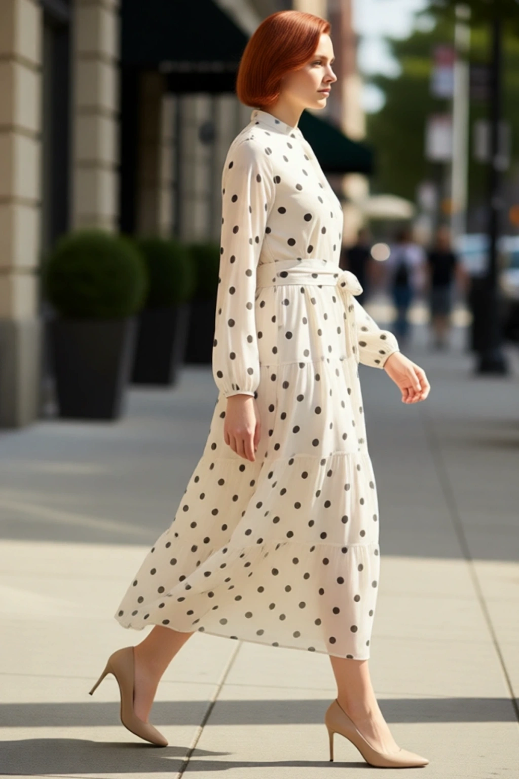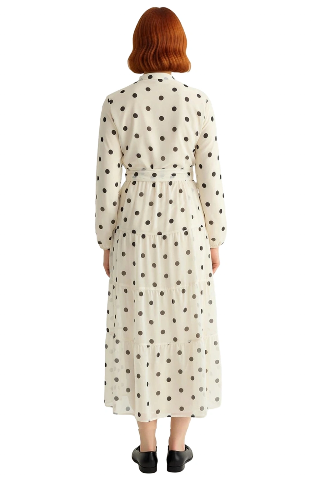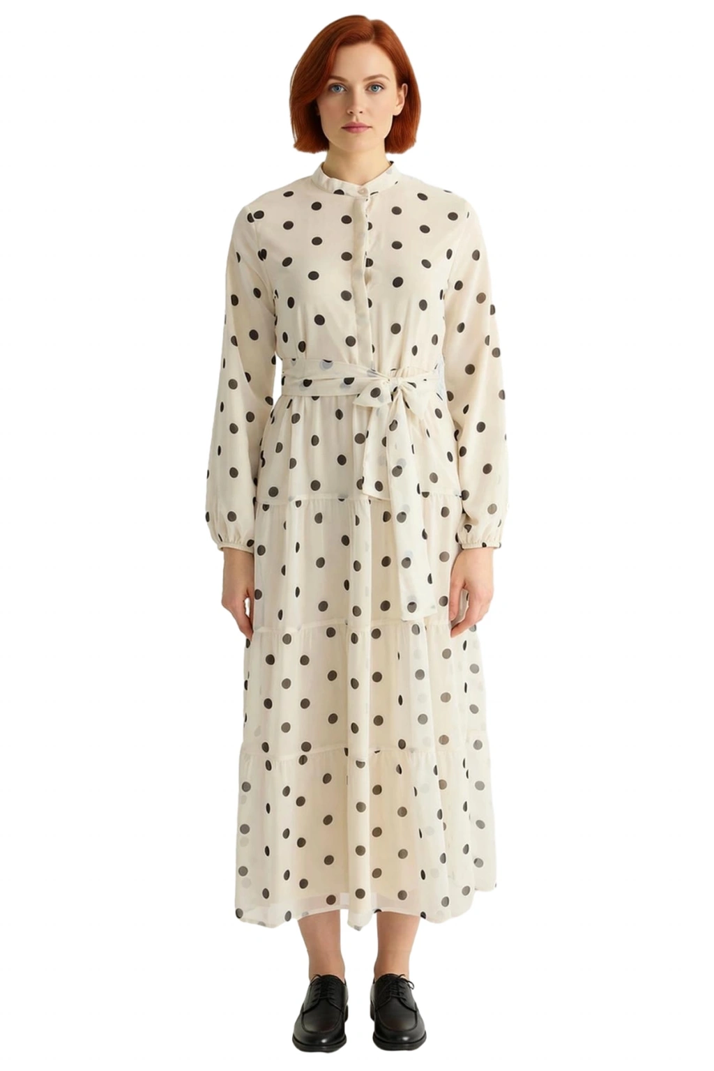 Ürün Özellikleri: A-line kalıp, %100 polyester materyal, puantiye desen, dik yaka, büzgülü kol, dokuma şifon kumaş, bej renk, kuşaklı ürün detayı, maxi boy, astarlı.