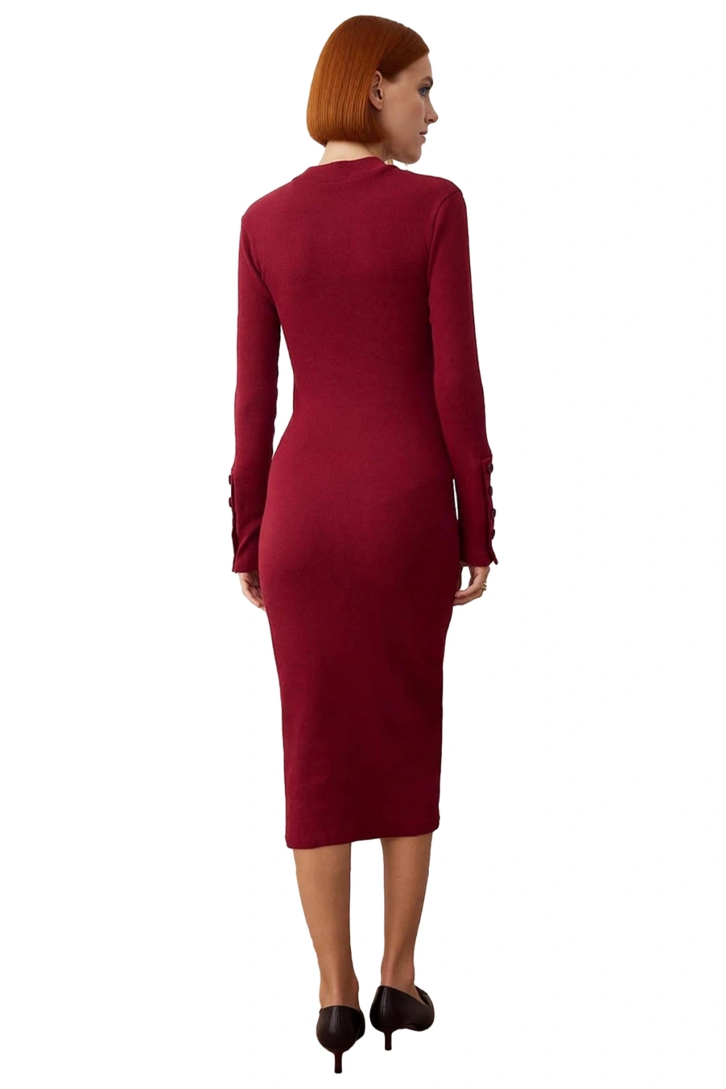 Ürün Özellikleri: Bodycon kalıp, rejenere kaşkorse materyal, düz desen, dik yaka, standart uzun kol, örme kumaş, bordo renk, düğmeli detay, midi boy.