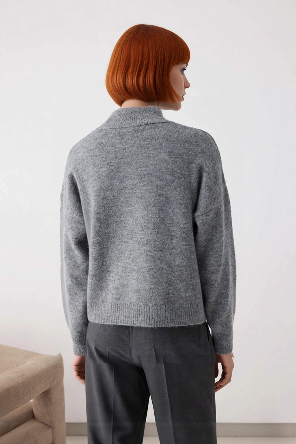 Ürün Özellikleri: Oversize kalıp, alpaka yün karışımlı materyal, düz desen, dik yaka, düşük kol, triko kumaş, gri renk.