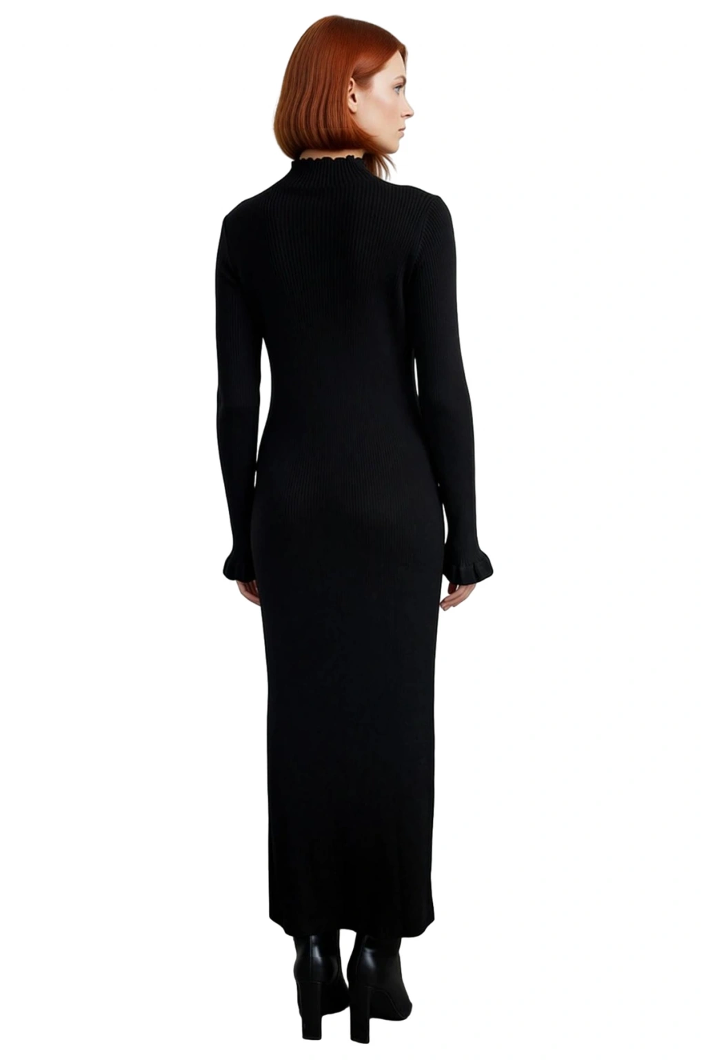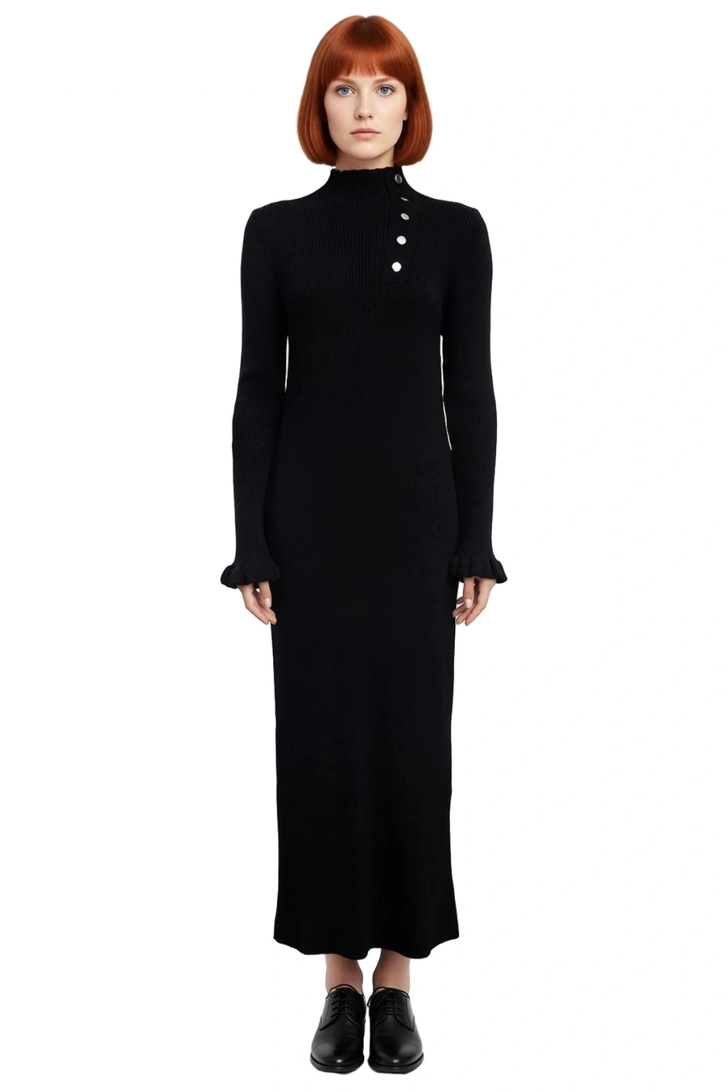 Şıklığı ve konforu bir araya getiren bu Kadın Ribana Triko Elbise, kış ve sonbahar aylarının vazgeçilmez parçası olacak. %100 Akrilik materyali sayesinde soğuk havalarda sizi sıcacık tutarken, cildinize ipeksi bir yumuşaklık hissi verir. Düz ve zamansız siyah deseniyle her kombinle kolayca uyum sağlar. Omuz kısmında yer alan aksesuar düğmeli detaylar, elbiseye modern ve özgün bir karakter katarken, shift kalıbı vücuda nazikçe oturarak rahat bir giyim deneyimi sunar. Bu maxi boy elbise, günlük ve casual ortamlar için mükemmel bir tercihtir.