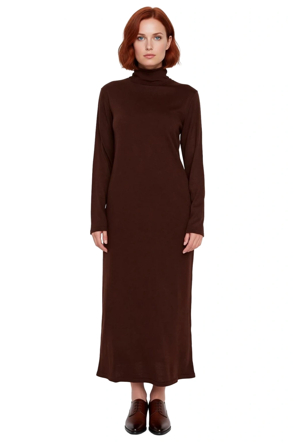 Ürün Özellikleri: A-line kalıp, akrilik materyal, düz desen, dik yaka, standart kol, triko kumaş, kahverengi renk, kuşaklı detay.