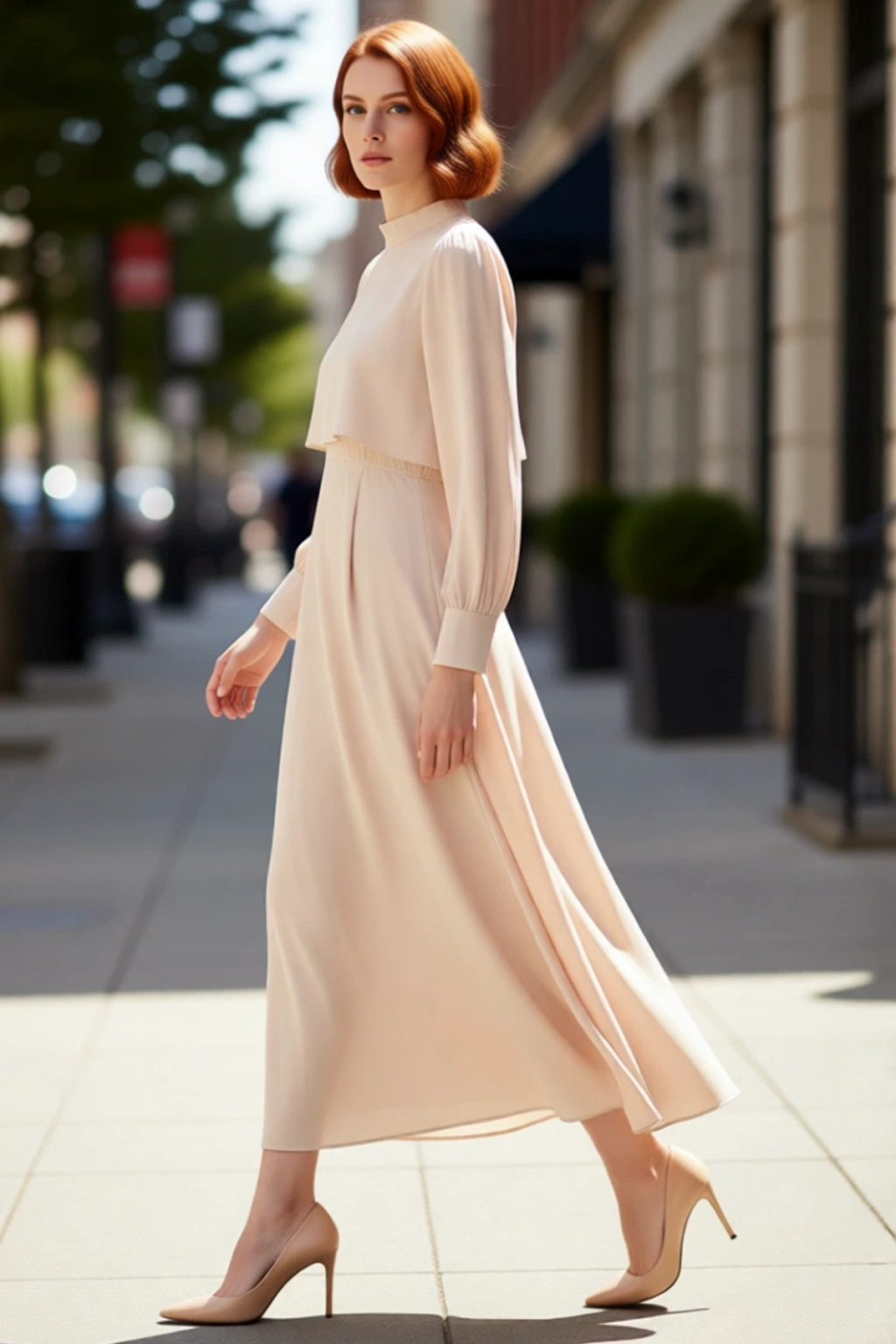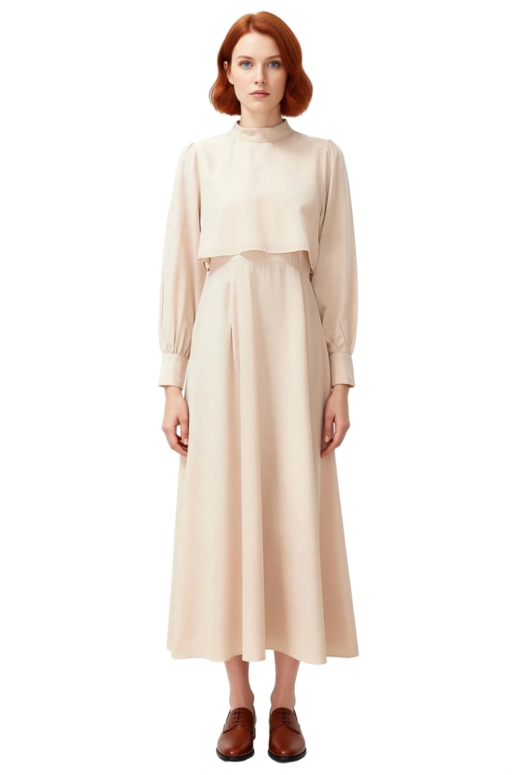 Günlük şıklığı ve üstün konforu bir araya getiren bu kadın elbisesi, modern kadının gardırobunda özel bir yer edinecek. Vücuda zarifçe oturan A-line kalıbı ile hareket özgürlüğü sunarken, 56% viskoz ve 44% polyester materyal bileşeni sayesinde yumuşak ve dökümlü bir yapıya sahiptir. Düz deseni ve zamansız bej rengi, her türlü aksesuarla kolayca kombinlenebilir bir temel oluşturur. Cool & Comfort personasına hitap eden bu elbise, İlkbahar ve Sonbahar mevsimlerinde ideal bir tercihtir. Astarsız tasarımı hafiflik ve nefes alabilirlik sağlarken, Ramadan koleksiyonunun ruhunu yansıtan zarif bir parçadır.