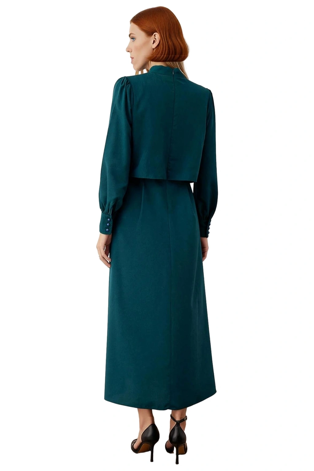 Dik yaka tasarımı, elbiseye sofistike bir hava katarken, standart uzun kol yapısı günün her anında rahatlık ve uygunluk sağlar. Dokuma (terryviskon) kumaş tipi, hem dayanıklı hem de cilt dostu bir dokunuş sunarak gün boyu konforunuzu garanti eder. Maxi boyu ile boyunuzu daha uzun gösteren bu elbise, özel detaylarıyla dikkat çeker. Makinede yıkanabilir özelliği ile bakımı zahmetsizdir, böylece zamandan tasarruf etmenizi sağlar ve elbisenin ilk günkü formunu uzun süre korumasına yardımcı olur.