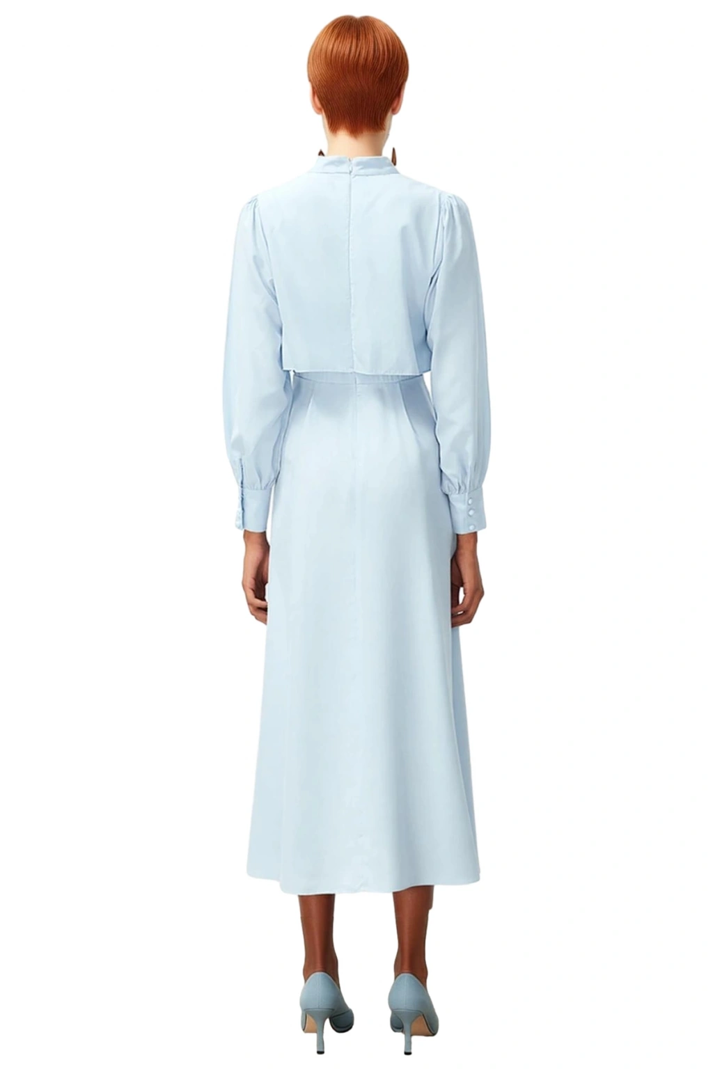 Elbisenin dik yaka detayı, boyun bölgesini zarifçe sararak hem sıcak tutar hem de sofistike bir çizgi oluşturur. Standart uzun kol yapısı, bileklerdeki manşet detayıyla şık bir bitiş sunar ve hareket özgürlüğünü destekler. Dokuma (terryviskon) kumaş tipi, dayanıklılığı ve dökümlü yapısıyla öne çıkar, böylece elbise üzerinizde adeta dans eder. Maxi boyu, her ortamda dikkat çeken ve uzun bir siluet yaratan bir zarafet sunar. Bakım kolaylığıyla da öne çıkan bu elbise, makinede yıkanabilir özelliğiyle pratik bir kullanım sunar ve formunu uzun süre korur.