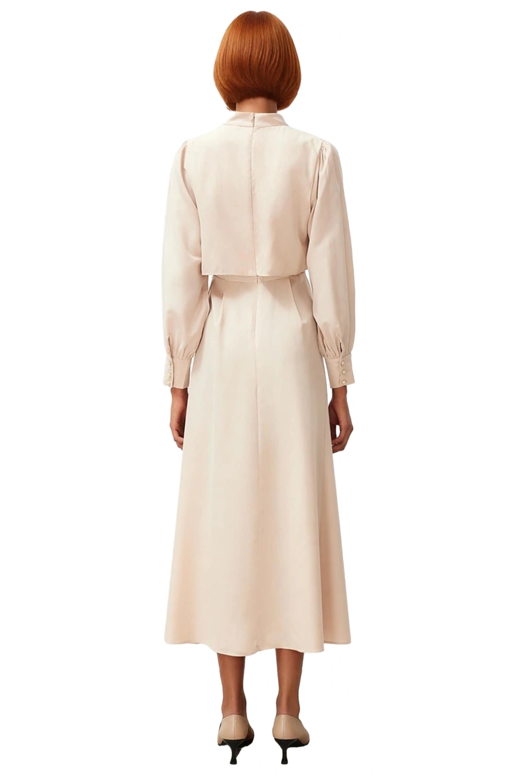 Ürün Özellikleri: A-line kalıp, viskon karışımlı materyal, düz desen, dik yaka, standart uzun kol, dokuma kumaş, bej renk, astarsız tasarım.