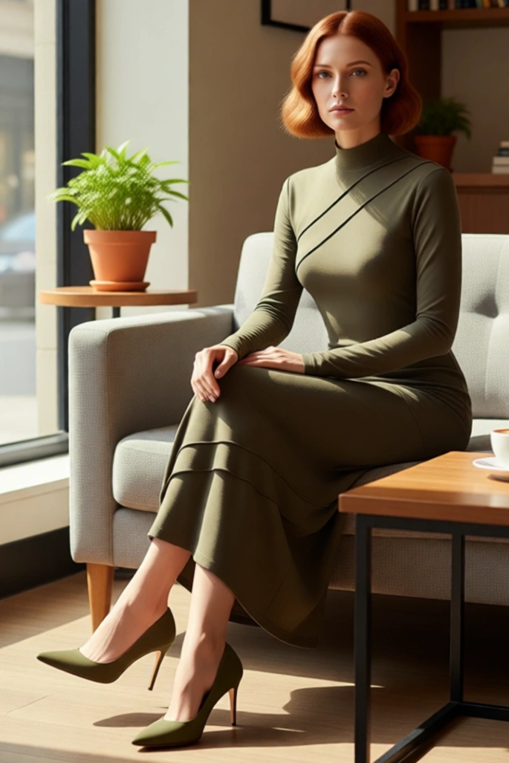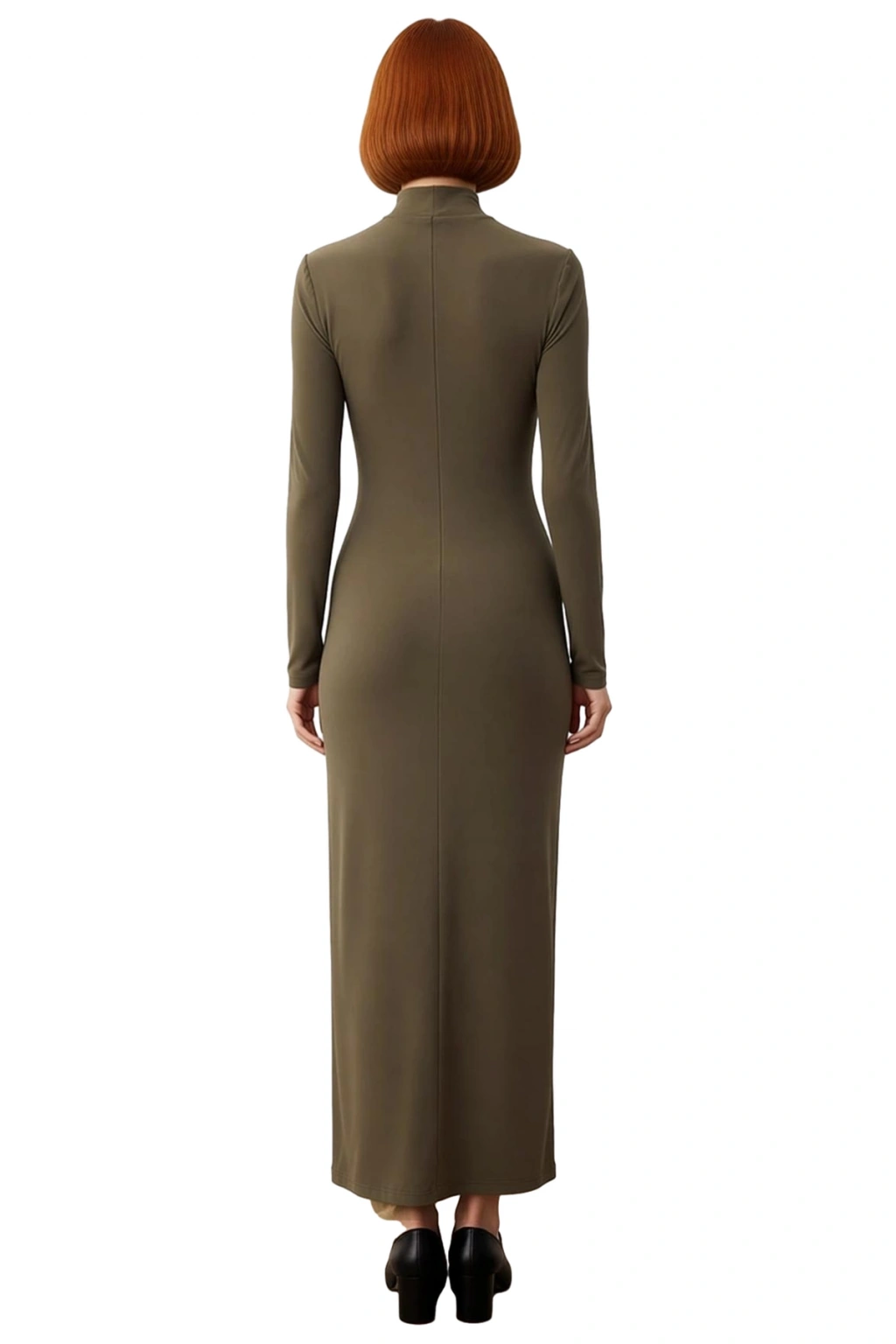 Ürün Özellikleri: Bodycon kalıp, %96 polyester %4 elastan materyal, düz desen, dik yaka, standart kol, örme kumaş, haki renk, karyoka dikişi.