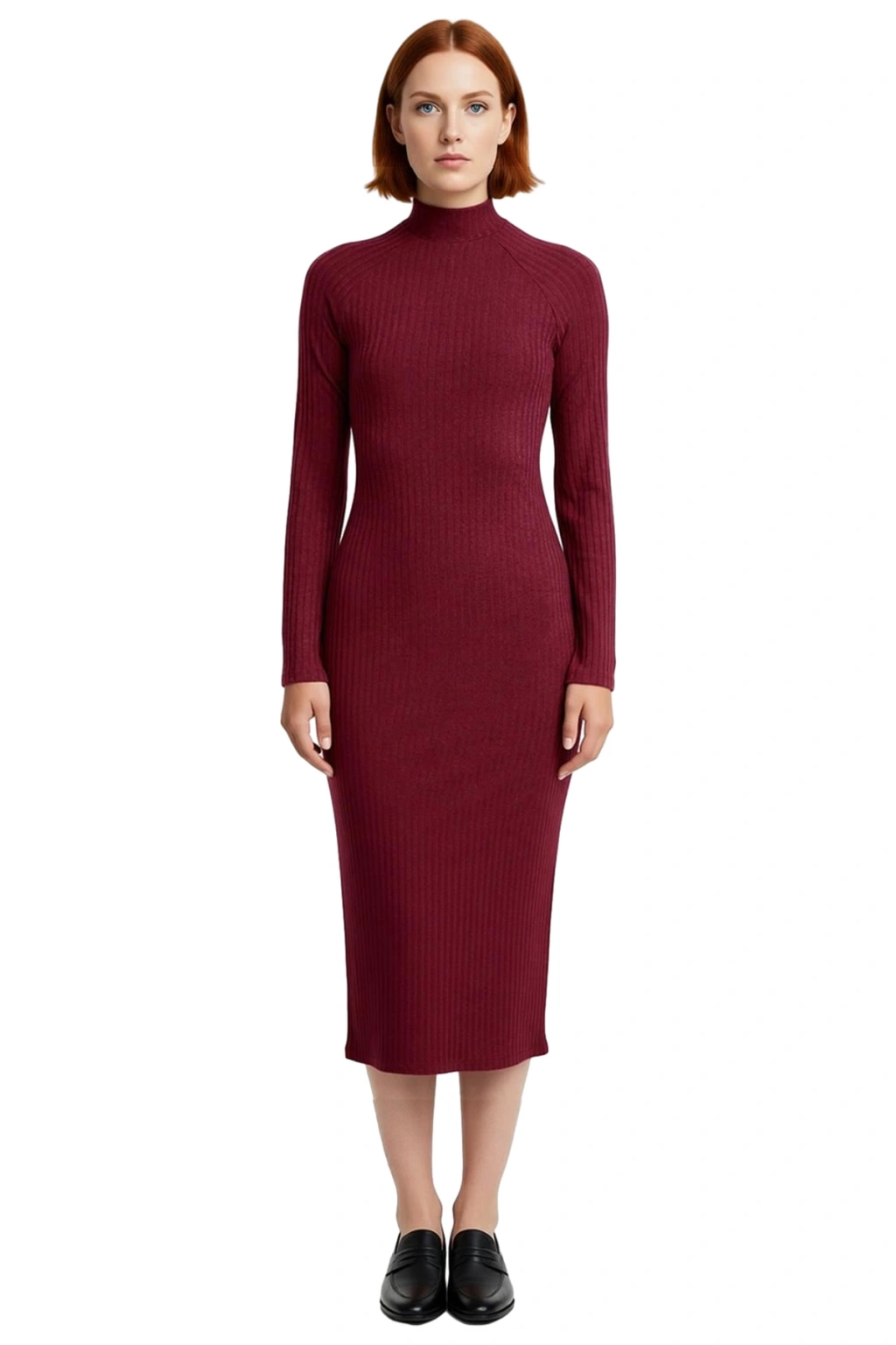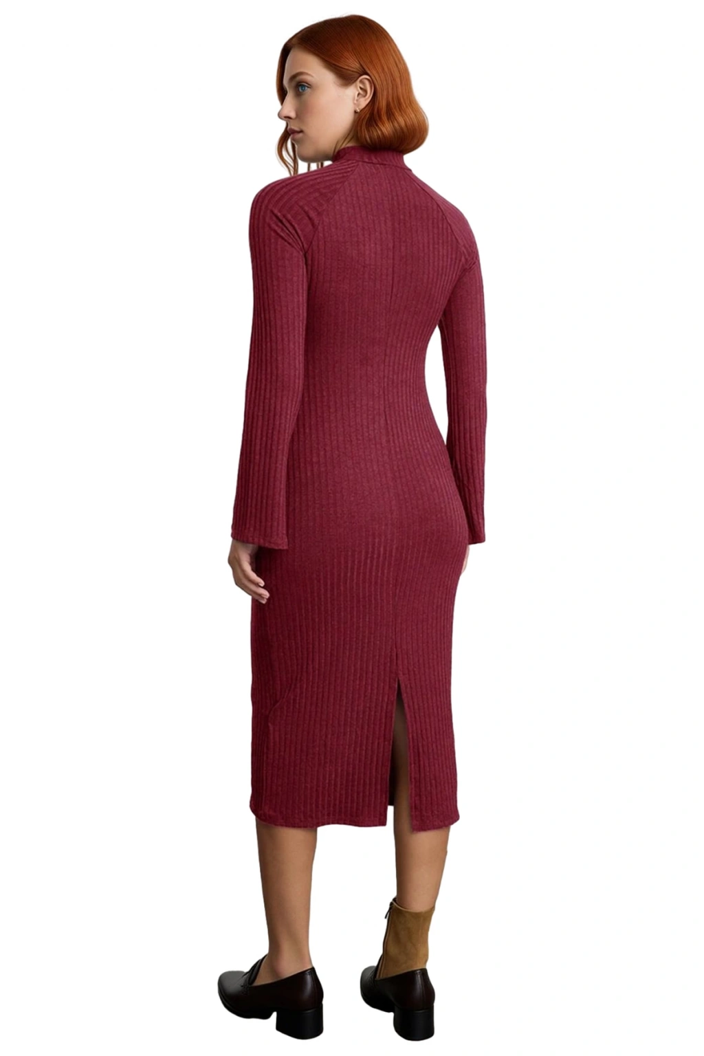 Ürün Özellikleri: Bodycon kalıp, örme materyal, düz desen, dik yaka, uzun standart kol, poliviskon kaşkorse kumaş, bordo renk, yırtmaçlı tasarım.