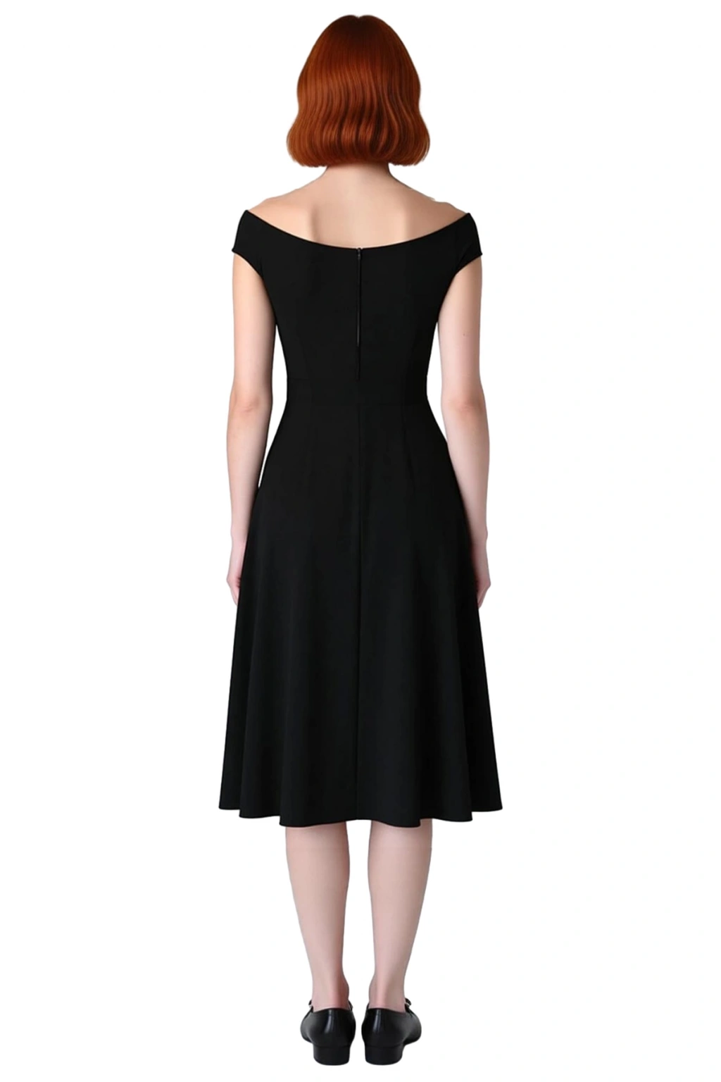 Ürün Özellikleri: Skater kalıp, polyester elastan materyal, düz desen, carmen yaka, kolsuz kol, dokuma krep kumaş, siyah renk.