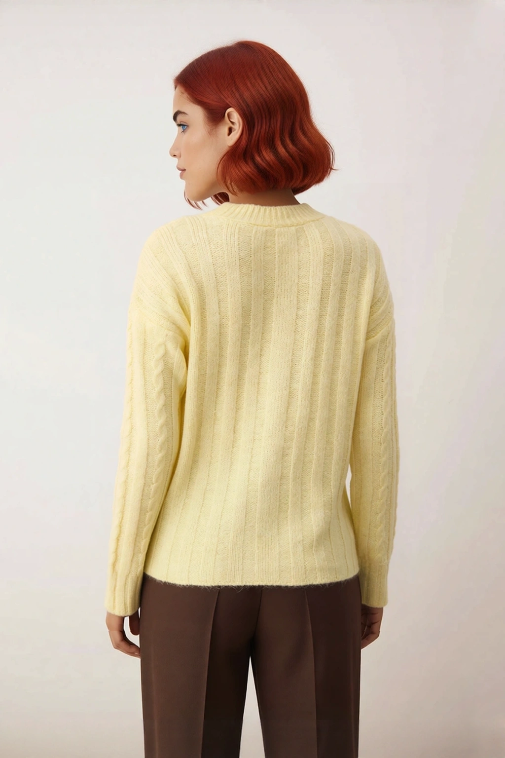 Ürün Özellikleri: Regular kalıp, Akrilik Polyester karışımı materyal, saç örgü desen, bisiklet yaka, düşük kol, triko kumaş, ekru renk.
