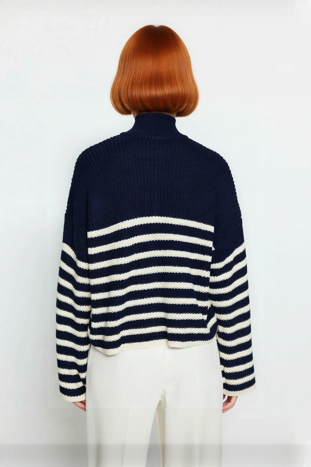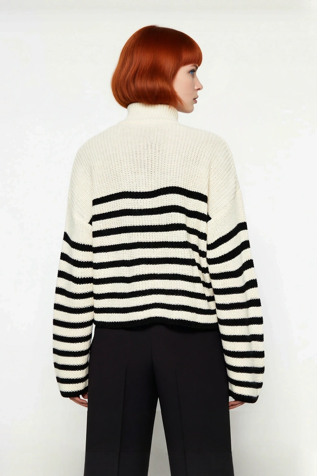 Ürün Özellikleri: Oversize kalıp, 100% akrilik materyal, çizgili desen, dik yaka, düşük kol, triko kumaş, ekru renk, baskısız tasarım.