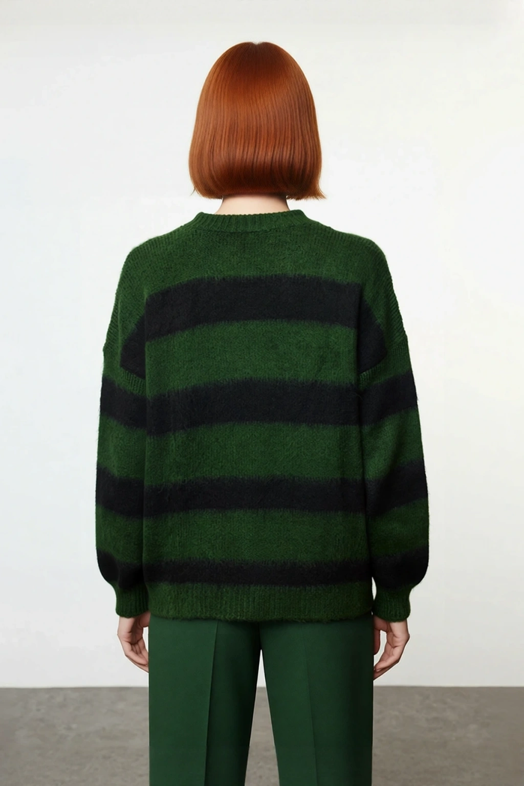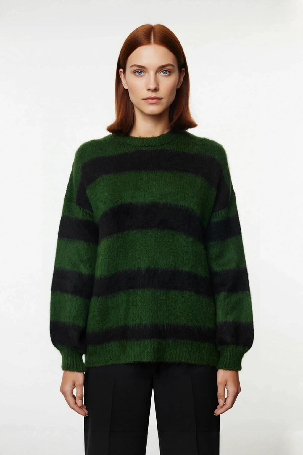 Ürün Özellikleri: Oversize kalıp, akrilik polyester materyal, çizgili desen, bisiklet yaka, düşük kol, triko kumaş, lacivert gri renk.