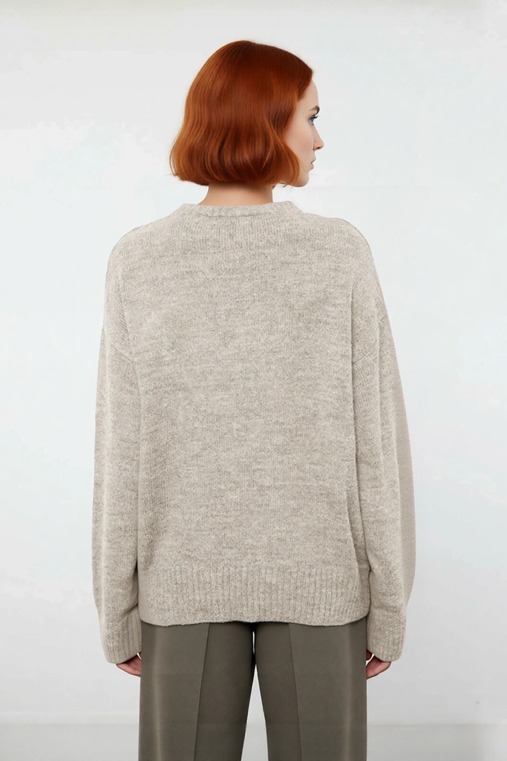 Ürün Özellikleri: Oversize kalıp, akrilik polyester poliamid materyal, düz desen, bisiklet yaka, düşük kol, triko kumaş, gri renk.