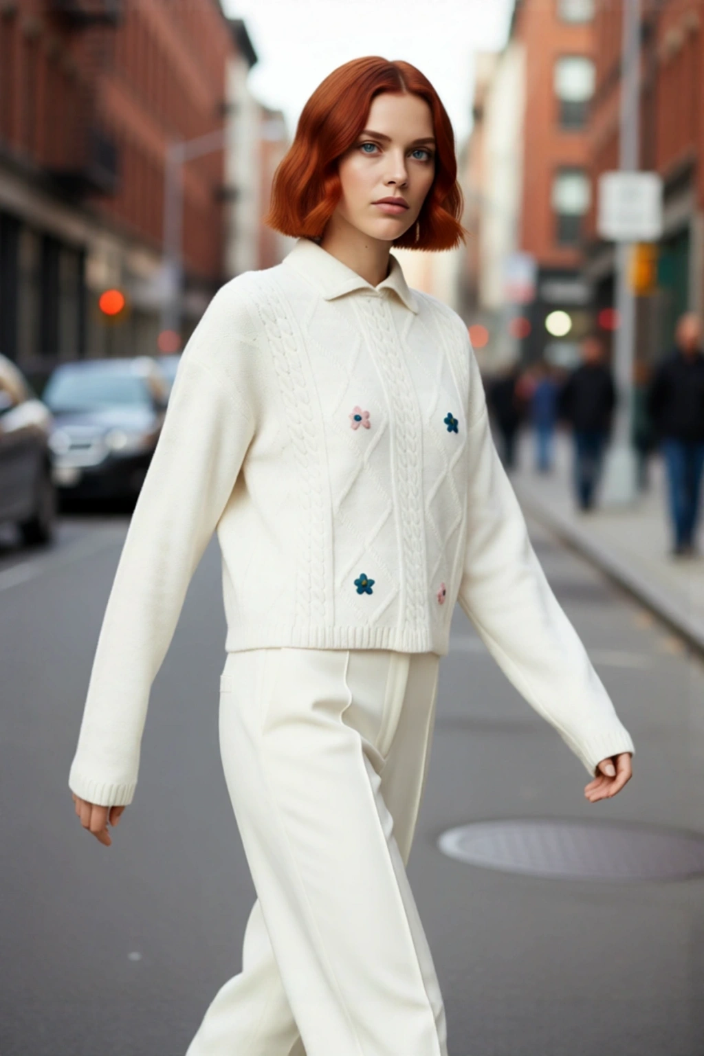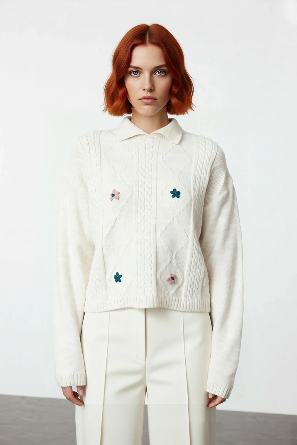 Ürün Özellikleri: Regular kalıp, akrilik materyal, saç örgü ve nakışlı çiçek desen, polo yaka, düşük kol, triko kumaş, bej renk.