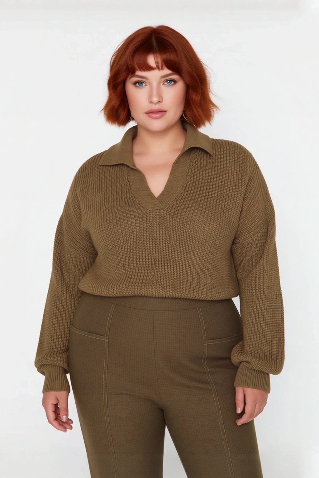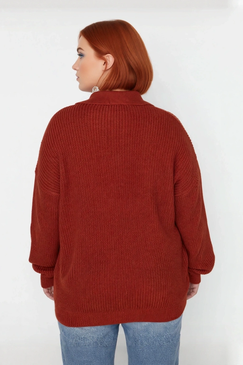 Ürün Özellikleri: Relaxed kalıp, akrilik materyal, düz desen, polo yaka, düşük kol, triko kumaş, kahverengi renk, baskısız tasarım.