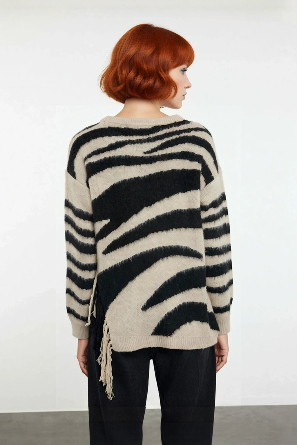 Bu modern kadın kazağı, oversize kalıbı ile rahatlığı ve şıklığı bir araya getirerek günlük stilinize sofistike bir dokunuş katar. Akrilik ve polyester karışımından oluşan materyali, soğuk havalarda üstün sıcaklık sağlarken, yumuşak triko dokusu cildinize hoş bir his verir. Bej ve siyahın armonisiyle oluşturulmuş zebra deseni, kazağa dinamik ve cesur bir hava katarken, stil sahibi görünmenizi sağlar. Yan tarafındaki yırtmaç ve dikkat çekici püskül detayları, bu kazağa özgün bir karakter kazandırır. Cool ve konforlu bir moda anlayışına sahip kadınlar için tasarlanmıştır.