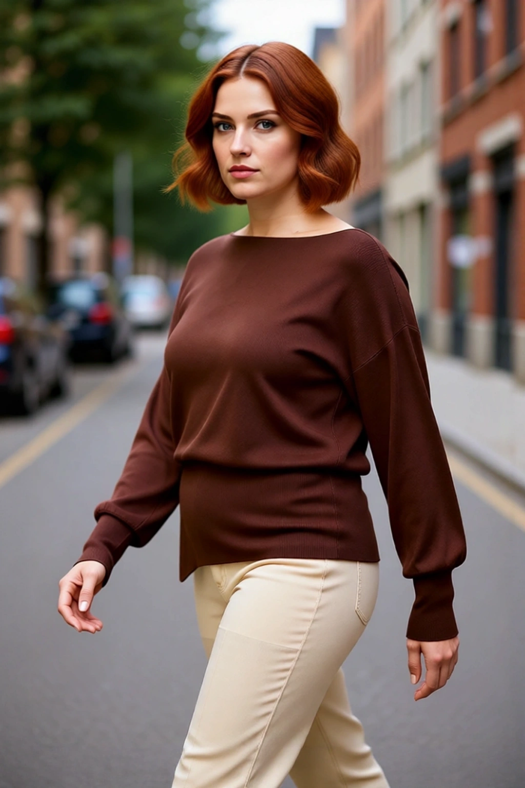 Ürün Özellikleri: Regular kalıp, viskoz akrilik materyal, düz desen, kayık yaka, düşük kol, triko kumaş, kahverengi renk, asimetrik kesim.