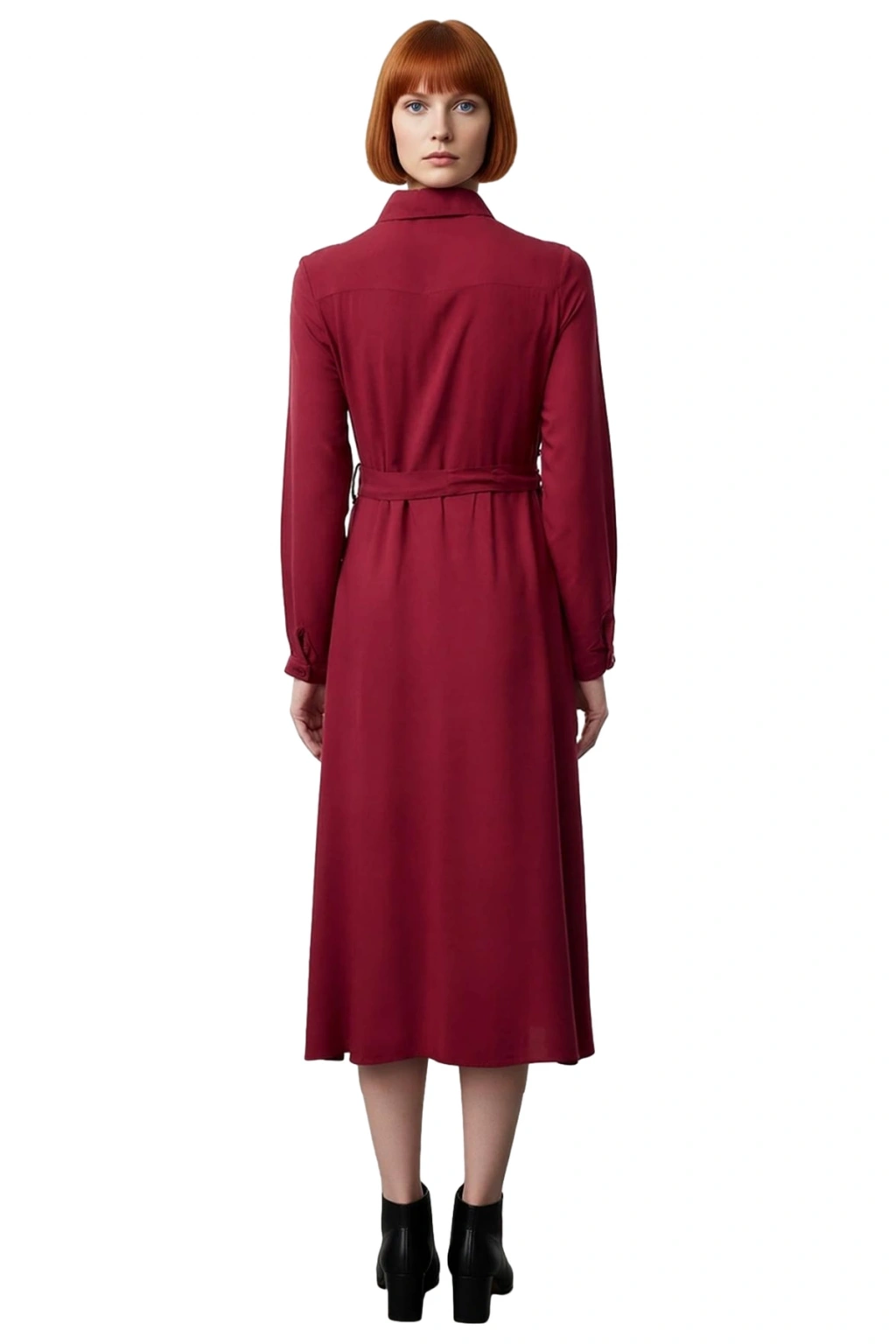 Ürün Özellikleri: Gömlek Elbise kalıp, 100% Viskoz materyal, düz desen, gömlek yaka, uzun standart kol, dokuma shally kumaş, bordo renk, kuşaklı ürün detayı, midi boy, full fermuar kapama, astarsız.