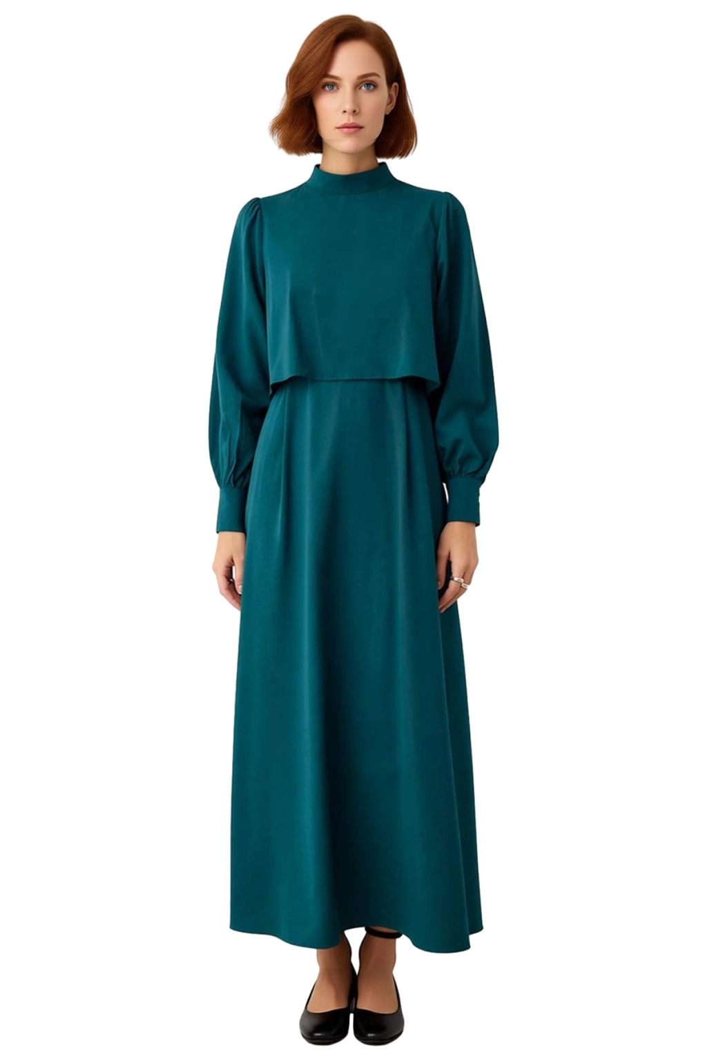 Elbisenin dik yaka tasarımı, klasik ve sofistike bir dokunuş katarken, standart uzun kol yapısı hem şıklığı hem de örtünmeyi bir arada sunar. Dokuma kumaş tipi (terryviskon) dayanıklılığı ve zarif duruşuyla dikkat çekerken, hareket özgürlüğünüzü kısıtlamaz. Maxi boyu ile uzun ve gösterişli bir görünüm sağlayan bu elbise, her adımda zarafetinizi pekiştirir. Bakımı oldukça kolay olan bu parça, makinede yıkanabilir özelliğiyle pratik bir kullanım sunar ve uzun ömürlü kalitesini korur.